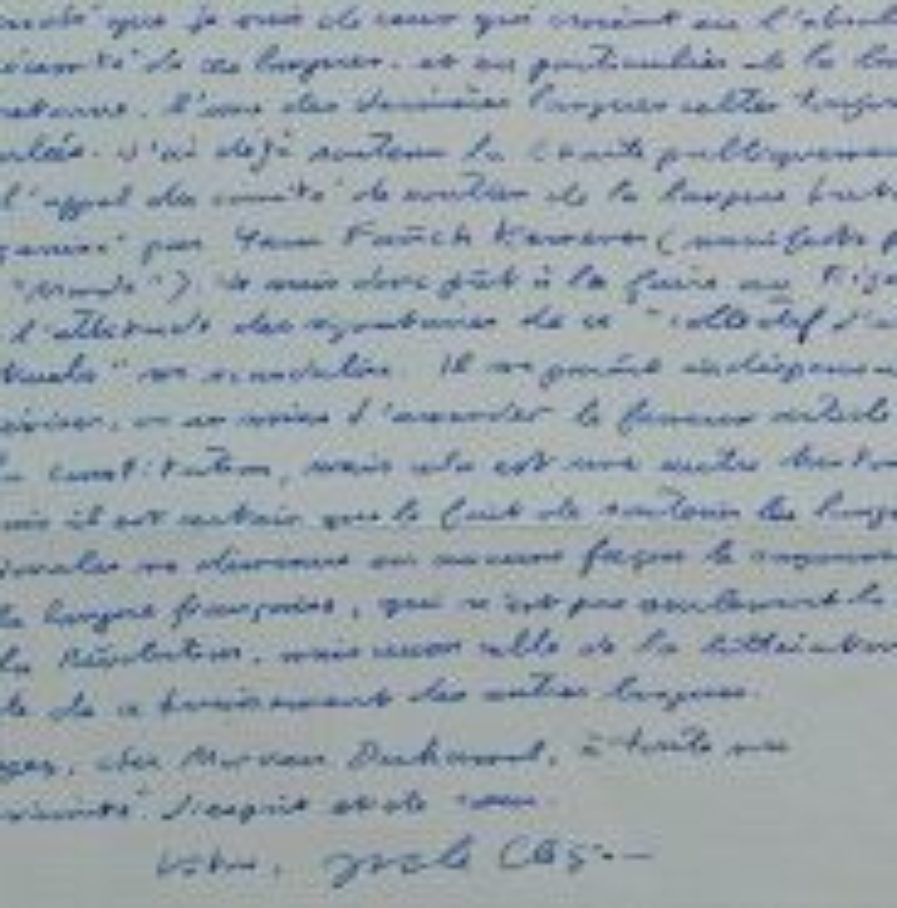 Le Clézio répond à la sollicitation de Morvan-Duhamel pour signer l'appel à ratifier la charte du Conseil de l'Europe à propos des langues régionales. "J'en suis d'autant plus touché que je suis de ceux qui croient en l'absolue nécessité de ces langues, et en particulier à la langue bretonne, l'une des dernières langues celtes toujours parlées. J'ai déjà soutenu la Charte publiquement, à l'appel du comité de soutien de la langue bretonne organisée par Yann-Fañch Kemener (manifeste publié au "Monde"). Je suis donc prêt à le faire au Figaro, car l'attitude des signataires de ce "collectif d'intellectuels" me scandalise. Il me parait indispensable de réviser, ou au moins d'amender le fameux article 2 de la constitution, mais cela est une autre histoire... Mais il est certain que le fait de soutenir les langues régionales ne diminue en aucune façon le rayonnement de la langue française, qui n'est pas seulement la langue de la Révolution, mais aussi celle de la littérature, faite de ce bruissement des autres langues".