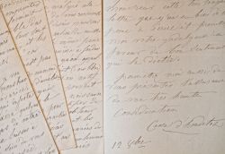Longue lettre de la comtesse d'Houtedot [probablement Césarine d'Houdetot (1794/1877), femme de lettres, épouse de Prosper de Barante et petit fille de la salonnière amie de Rousseau]. Elle expose longuement ses idées pour venir en aide aux plus démunis, s'indignant de l'avarice des possédants. "Aujourd'hui, monsieur, je voudrais vous parler de la monstruosité à la mode, de l'avarice, de cette avarice enfin qui infeste comme d'un phylloxéra quelques uns des plus beaux ceps de notre pays, mais je veux laisser à madame Sand le soin de vous résumer toute ma pensée. Elle s'en acquittera mieux que moi, la chère et digne Reine, car on peut le dire, celle là n'est pas notre débitrice, et sa souveraineté ne nous a pas amoindris, et si on avait fait plus attention à ce qu'elle fait dire par monsieur de Boisguilbaut [dans Le Pêché de Monsieur Antoine, 1847], dans un ouvrage paru il y a une trentaine d'années, on ne se heurterait pas dix fois par mois sans sortir de chez soi, en voyant très peu de monde, à ce qu'il y a d'immense dans ce manque de solidarité dont je voudrais entrevoir la fin, dans des congrès pavés de bonne intentions [...]". [Césarine d'Houdetot, très pieuse, avait participé à de nombreuses oeuvres de charité].