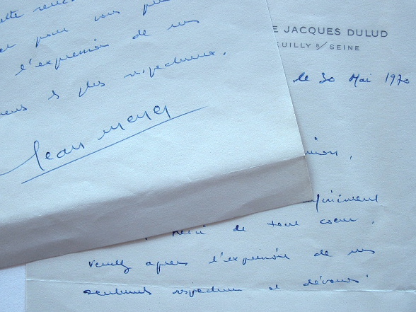 Jean Meyer transmet à Simone Simon un paquet qu'un de ses admirateurs lui a laissé à son attention. «Je n'aurais peut-être pas dû attendre cette rencontre pour vous écrire [...]». Dans sa seconde lettre, il la remercie de ses félicitations «qui m'ont infiniment touché. Merci de tout coeur [...]». [Simone Simon avait joué dans La Courte Paille, pièce écrite et montée en 1967 par Jean Meyer].