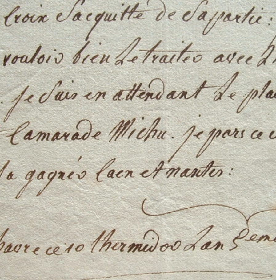 Louis Michu, alors en tournée en Normandie, recommande à son camarade du Théâtre Italien un éclairagiste, M. La Croix, «chargé ici de la partie du luminaire et qui désirerait fort, ayant plusieurs entreprises à Paris, pouvoir réunir celle de notre Spectacle». Il estime que ses compétences pourraient leur servir. «Comme il entend parfaitement cette partie, s'il est possible d'après les connaissances que vous lui donnerez que notre Société y trouve du bénéfice, je crois que nous ferions très bien d'en profiter. M. Leth, le directeur de ce spectacle est parfaitement satisfait de la manière dont monsieur La Croix s'acquitte de sa partie [...]». Il ajoute : «[...] Votre ami et camarade Michu. Je pars ce soir du Havre pour Rouen et de là, gagnerai Caen et Nantes».