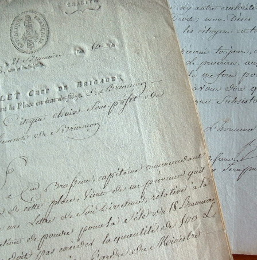 Lettres du chef de brigade Bertholet, commandant la place de Briançon. Consignes pour le passage à cheval sur le pont-levis de Pignerol et préparatifs de la fête du 18-brumaire.
