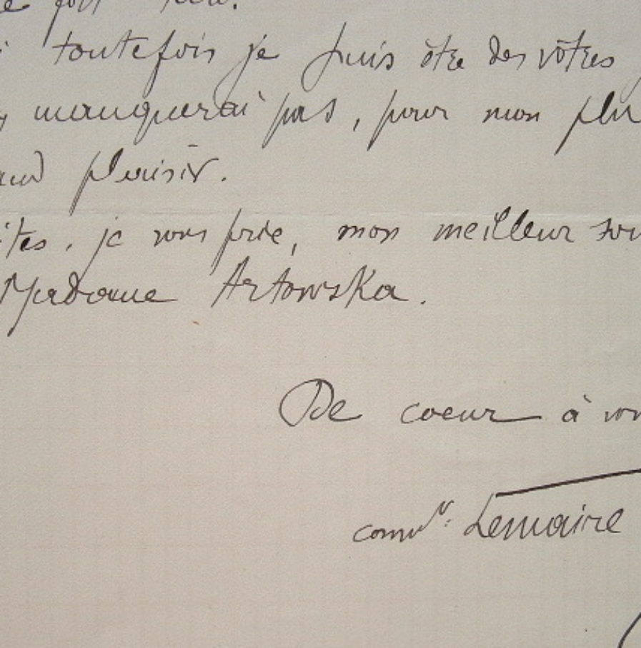 Le commandant Lemaire, de retour d'Afrique, s'excuse de ne pouvoir répondre favorablement à la demande d'Arctowski. «Le 12, je dois conférencer à Mons d'où je ne rentrerai très probablement que fort tard. Si toutefois je puis être des vôtres, je n'y manquerai pas, pour mon plus grand plaisir».
