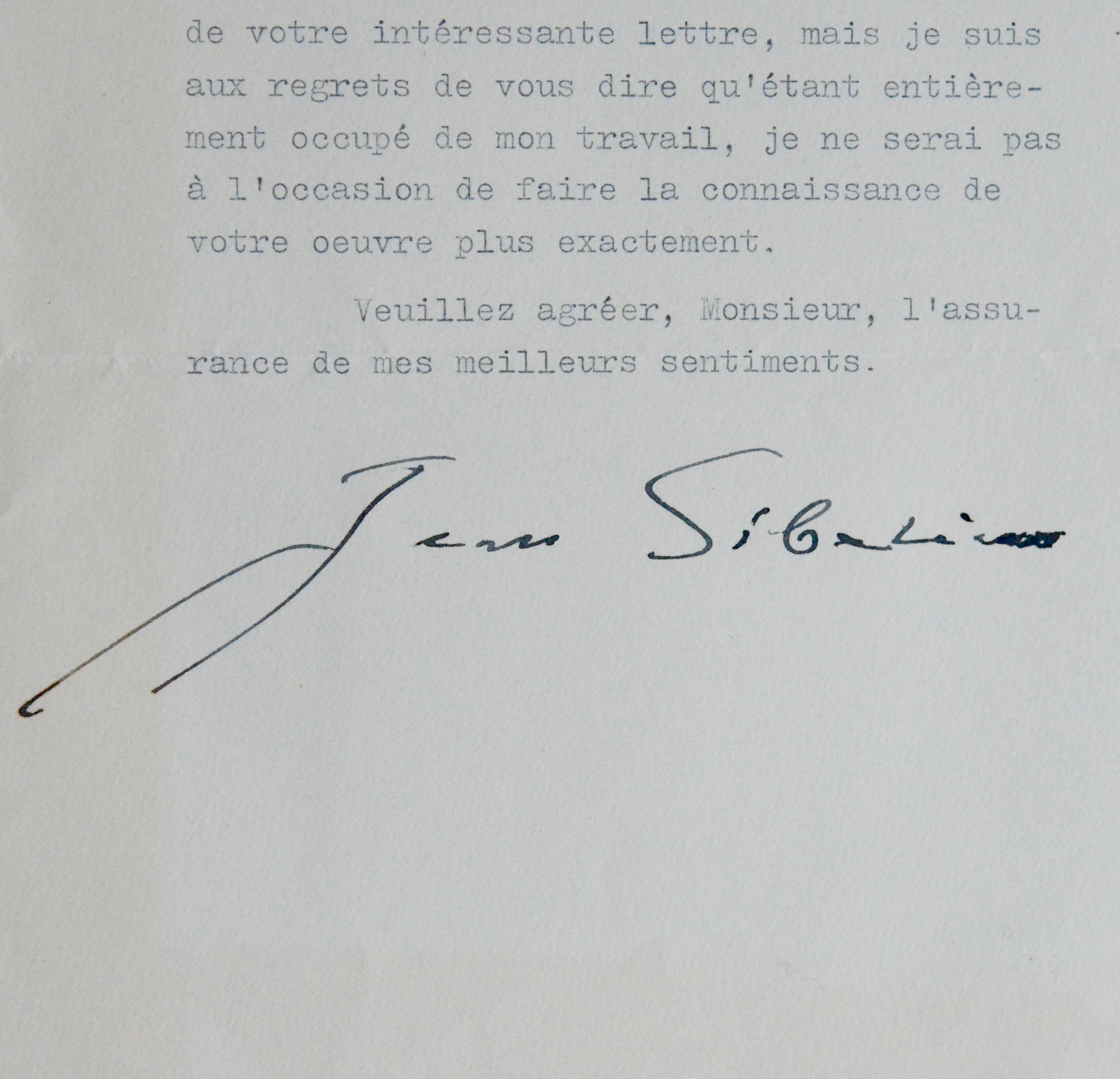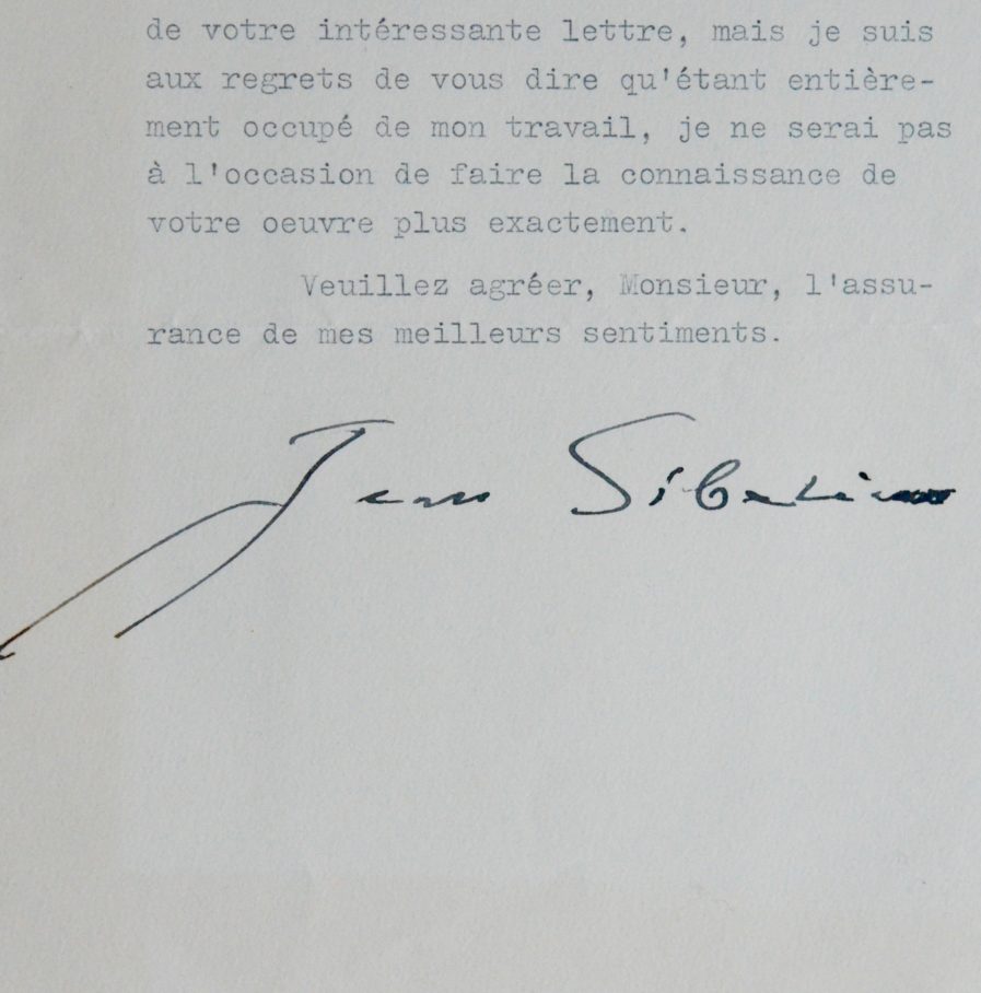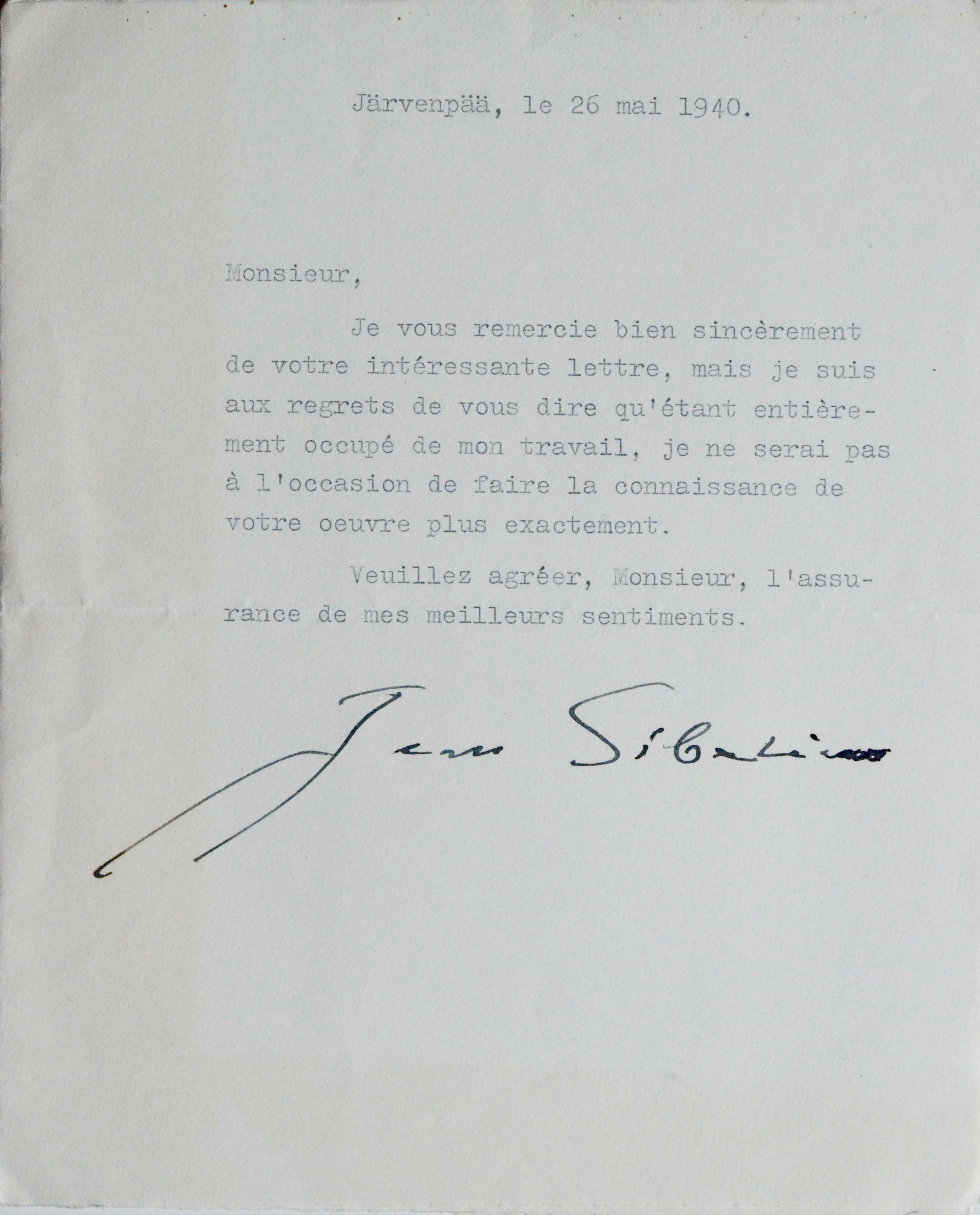 Le compositeur finlandais Sibelius a bien reçu la lettre de son correspondant, mais est trop occupé pour "faire la connaissance de votre oeuvre plus exactement".