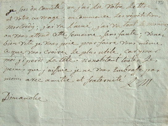 Jean-Baptiste Lemoyne, qui débute les répétitions de son dernier opéra, demande à son librettiste Guillard, de le rejoindre sans tarder. «Je sors du comité où j'ai lu votre lettre et votre ouvrage ; on commence les répétitions mercredy ; j'ai vu Lainé, j'ai vu tout le monde ; on vous attend cette semaine sans faute ; venez bien vite, je vous prie, pour faire vous même ce que vous croirez le plus utile, car pour moi j'y perds la tête [...]». [Lemoyne et Guillard ont collaboré à deux opéras : Elfrida, créé au Théâtre Italien en 1791 et Miltiade à Marathon, à l'Opéra, le 15 brumaire an 2].