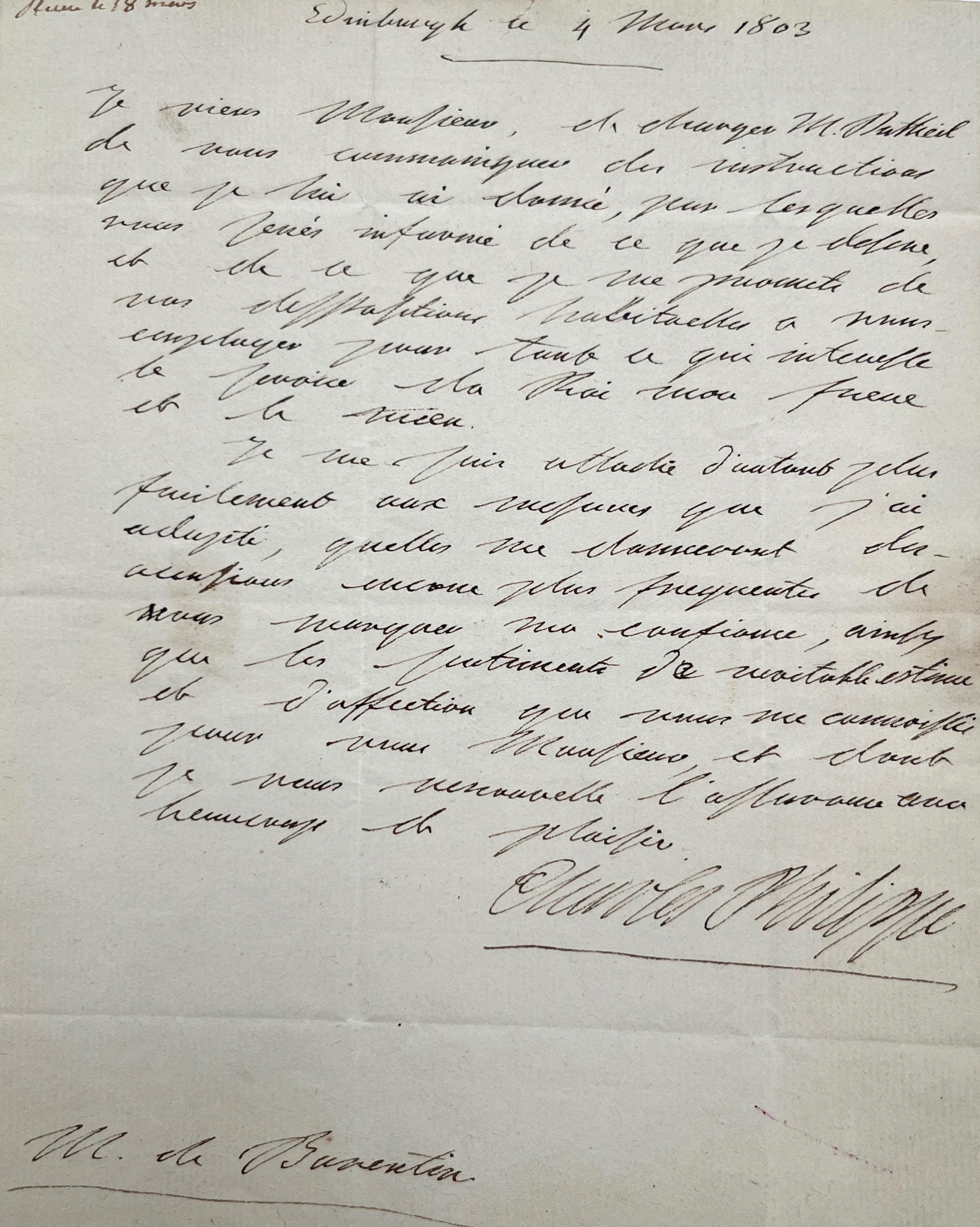 Destinataire : Charles de Barentin (1738-1819), magistrat et homme d'État, à Londres