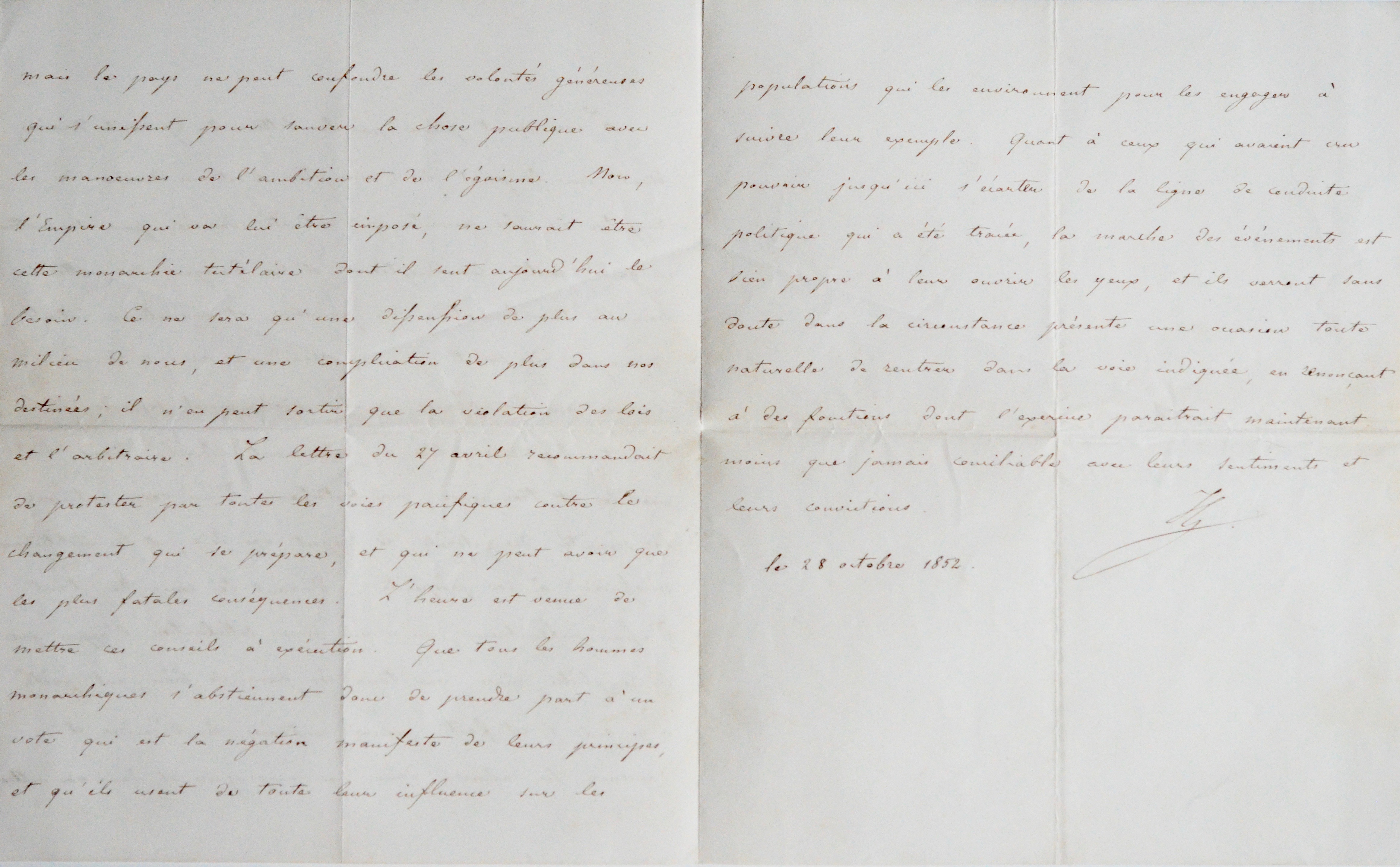 Comte de Chambord (Paris, 1820/1883)Très intéressant manuscrit politique du comte de Chambord , signé "Hy", écrit 3 jours après son manifeste dans lequel il protestait contre le risque de rétablissement d'un Empire.