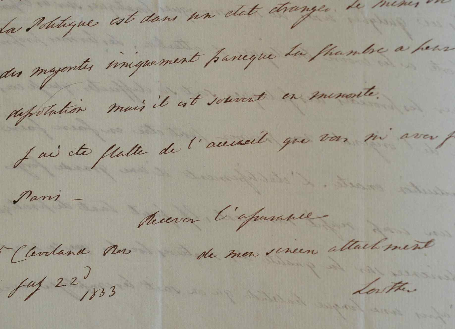 Dans cette lettre rédigée en français, William Lowther, comte de Lonsdale, évoque les difficultés à forger le fer. Son correspondant lui a envoyé son livre sur les forges : «L'établissement d'une grande forge tout d'un coup réussit rarement. Il faut tant de pratiques et d'expériences sur la qualité des matières locales que ce n'est qu'après une longue habitude qu'on sait les employer avec économie. Je conseillerais de faire une très courte analyse des propriétés du charbon, de la tourbe, et de la chaux, laquelle on réglerait [sic] tous les divers procédés de la fabrication du fer.»