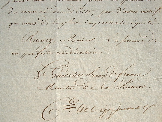 Pierre Denis Peyronnet (comte de) (Bordeaux, 1778/1854)Le ministre de la Justice, Peyronnet, désapprouve la conduite de son procureur d'Abbeville, lors de l'affaire Duval Boidin et Gavelle, et le lui fait savoir. «J'ai reconnu que vous aviez été animé de quelque aigreur personnelle vis-à-vis du S. Gavelle, et que dans vos rapports avec M. le procureur général, vous avez manqué aux égards que vous devez à ce magistrat, notamment dans l'entrevue que vous avez eue avec lui à Amiens. Vous avez eu le tort de rapporter même à des amis intimes, les bruits que la malignité faisait courir sur le compte de votre chef, et de leur donner par là, quelque crédit [...]». Cependant, il reconnait le zèle qu'il a déployé pour «la répression d'un délit fort dangeureux pour la société».