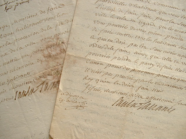 Henri-Charles Tavanes (Saulx, comte de) (Lux, 1686/1761)Le comte de Tavanes, lieutenant général de Bourgogne, rappelle les règles de la prise d'armes par les habitants et le tir du canon, soumises à son autorisation. Il veut éviter tout abus, toute prise d'armes générale par les habitants. Dans les cas exceptionnels et d'urgence, il faut en référer à l'état major. «Il peut arriver des cas pressés où pour le bien et l'utilité de la ville et pour arrêter quelque désordre, il convient de mettre quelques habitants sous les armes, les armes devant prêter main forte à la justice ; ces cas arrivant, si vous avés dans votre ville, un état major, soit un lieutenant du roy ou un major, comme ils ont le commandement des armes, vous devés vous adresser à luy pour les prier de les faire prendre ; ils ne peuvent ni ne doivent le refuser dans ces cas sur votre réquisition [...]. Il y a bien des villes où lors des Te Deum, on fait prendre les armes aux habitants, ce qui ne doit pas être quand la lettre du Roy ne l'ordonne pas et quand les ordres que je vous adresse en conséquence de ceux de Sa Majesté ne le prescrivent pas ; je vous prie que cela n'arrive plus [...]». Dans la seconde lettre, il accepte de mettre quelques habitants sous les armes pour la procession de la fête Dieu, à Bourbon-Lancy. «Vous pouvés en faire mettre un petit nombre, mais il n'est pas nécessaire d'y faire mettre tous les habitants».