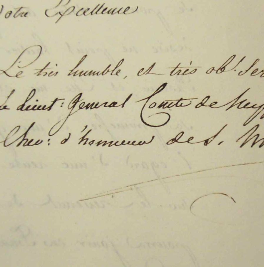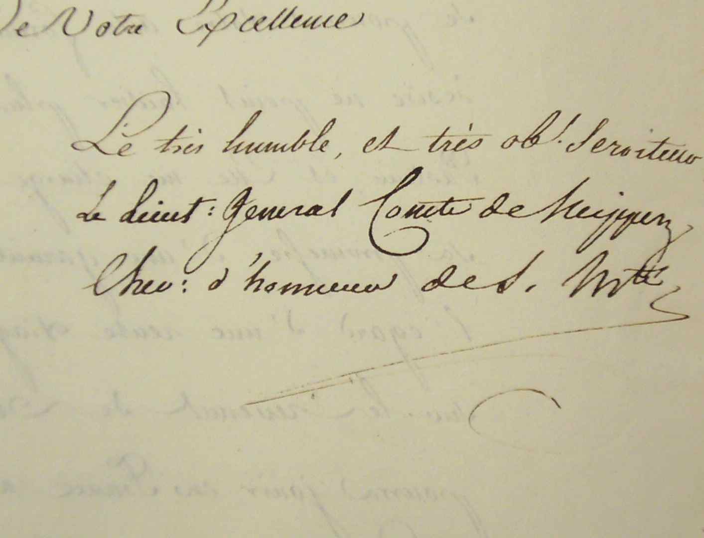 Albert Adam Neipperg (comte de) (Vienne, 1775/1829)L'Archiduchesse de Parme et de Plaisance [Marie-Louise], ayant appris qu'il avait reçu le consentement formel du Saint-Siège "de donner votre démission à l'Évêché de Plaisance", le prie d'envoyer au plus vite "votre acte formel de renonciation. Sa Majesté désire ne point laisser plus longtemps votre Diocèse sans Pasteur, et Elle me charge de renouveler à Votre Excellence sa promesse d'une garantie [...] d'une rente viagère de 12 mille francs inscrite sur les revenus de votre Évêché, dont Votre Excellence pourra jouir en France à compter du jour de sa renonciation [...]". [Toujours fidèle à Napoléon, ce prélat fut obligé de se démettre de son siège (7 mai 1817). Il se fixa alors à Paris.]