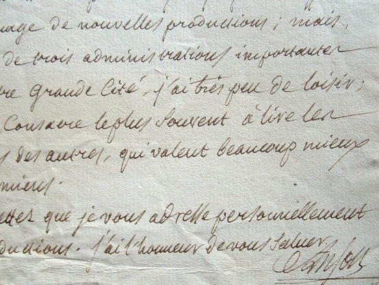 Pierre Hubert Anson accuse réception de sa nomination à la Société d'Emulation d'Amiens. «Je vous prie d'être auprès de la Société l'interprète de ma sincère reconnaissance. Je désirerais bien pouvoir quelquefois lui offrir l'hommage de nouvelles productions ; mais, chargé de trois administrations importantes dans notre grande cité, j'ai très peu de loisir ; et je le consacre le plus souvent à lire les ouvrages des autres, qui valent beaucoup mieux que les miens [...]».