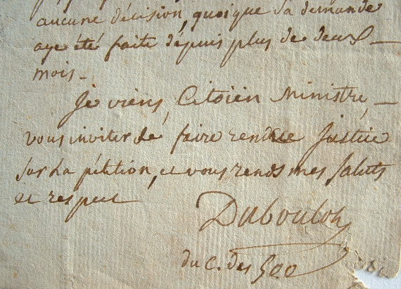 Dubouloz appuie une demande d'un commandant d'artillerie de la 1ère division de l'armée du Rhin, pour un cheval de «remonte». «Il n'y a eu, à cet égard, aucune décision, quoique sa demande aye été faite depuis plus de deux mois [...]».