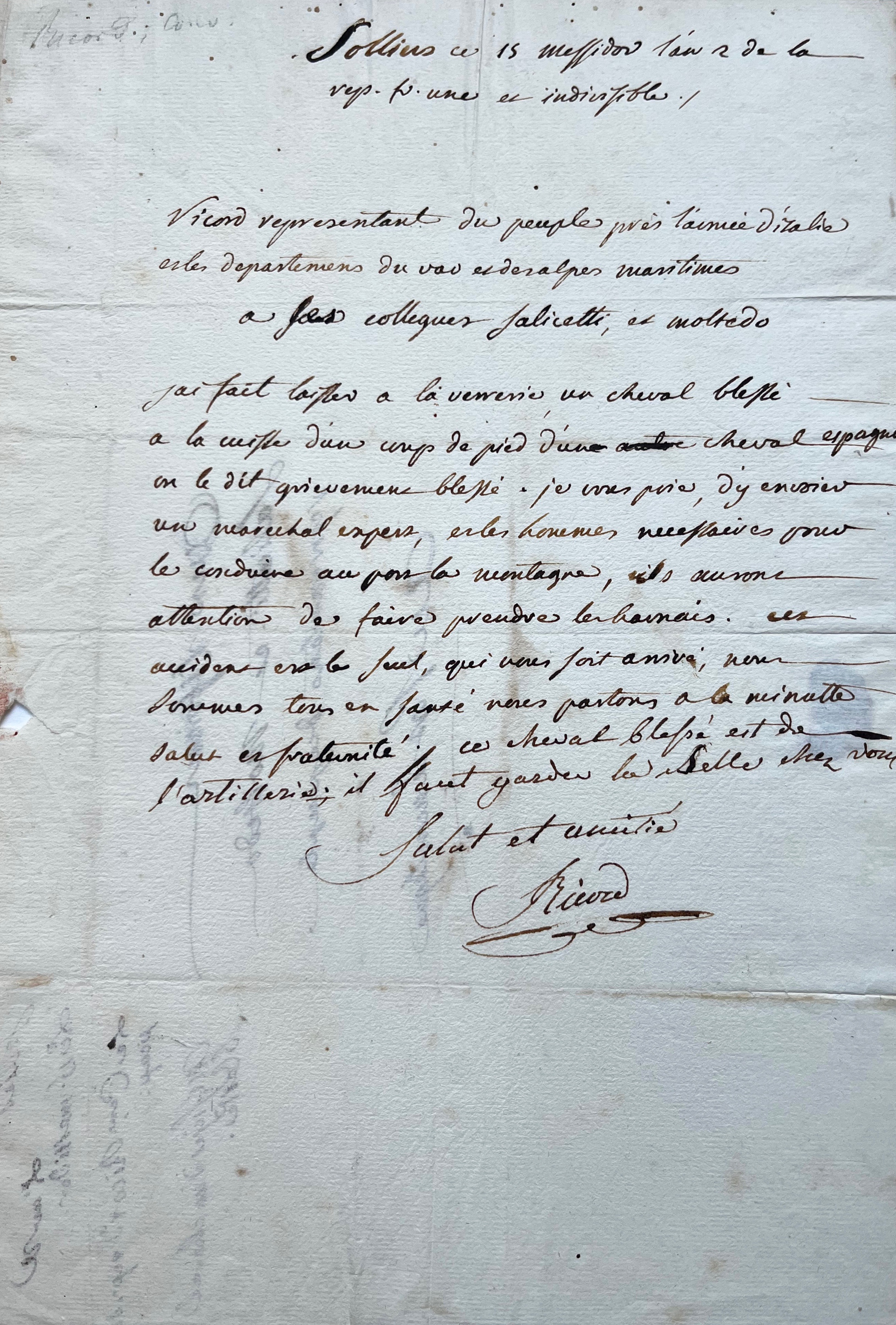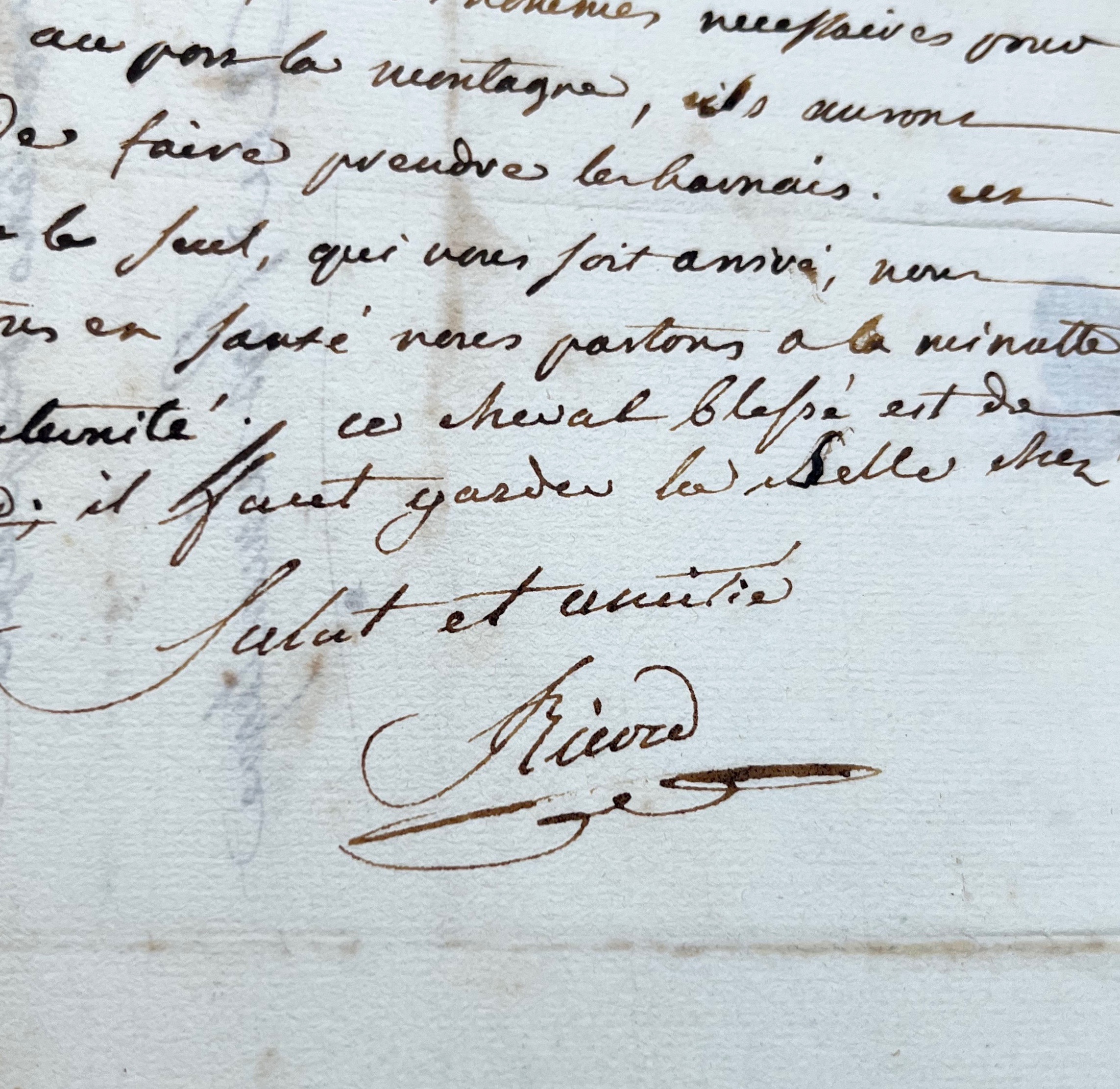 "J'ai fait laisser à la verrerie un cheval blessé à la cuisse d'un coup de pied d'un cheval espagnol. On le dit grièvement blessé. Je vous prie, d'y envoyer un maréchal expert, et les hommes nécessaires pour le conduire au port la montagne, ils auront attention de faire prendre les harnais". Ricord précise que c'est le seul accident qui leur soit arrivé "nous sommes tous en santé nous partons à la minutte [...]".