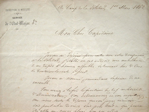 Alors que la convention de Soledad vient d'être signée (19 février 1862) entre le gouvernement mexicain et les puissances alliées (Espagne, Grande-Bretagne et France), l'Etat-major des troupes françaises [l'amiral Jurien de La Gravière] décide d'établir en ce lieu «une ambulance et un dépôt d'hommes affaiblis se trouvant hors d'état de continuer la route à pied». Dans cette missive, le chef d'Etat-major divisionnaire, Capitan (?), nomme Taillian en charge du poste et lui donne ses instructions détaillées. «Vous exercerez à la fois les fonctions de chef militaire et d'administrateur ; vous ordonnancerez et vous acquitterez vous-même toutes les dépenses que vous jugerez nécessaires soit pour l'achat des vivres soit pour tout ce qui pourra être utile aux troupes placées sous vos ordres. Vous formerez un magasin avec toutes les vivres et approvisionnements qui ne suivront pas la colonne [...]. Il est bon que vous sachiez que de toutes les denrées, la plus rare dans ce pays est le biscuit et qu'il importe par conséquent de la conserver. Vous aurez probablement à passer des marchés pour fournir du pain aux malades et aux hommes affaiblis [...]. Vous aurez à vous tenir en relations constantes, d'une part avec le camp de la Téjeria, d'autre part avec la colonne expéditionnaire. Pour cela, vous requererez deux guides à cheval du pays, auxquels vous pairez une indemnité journalière fixe [...]. Vous aurez toujours une réserve de maïs pour donner aux animaux de passage à la Soledad [...]».