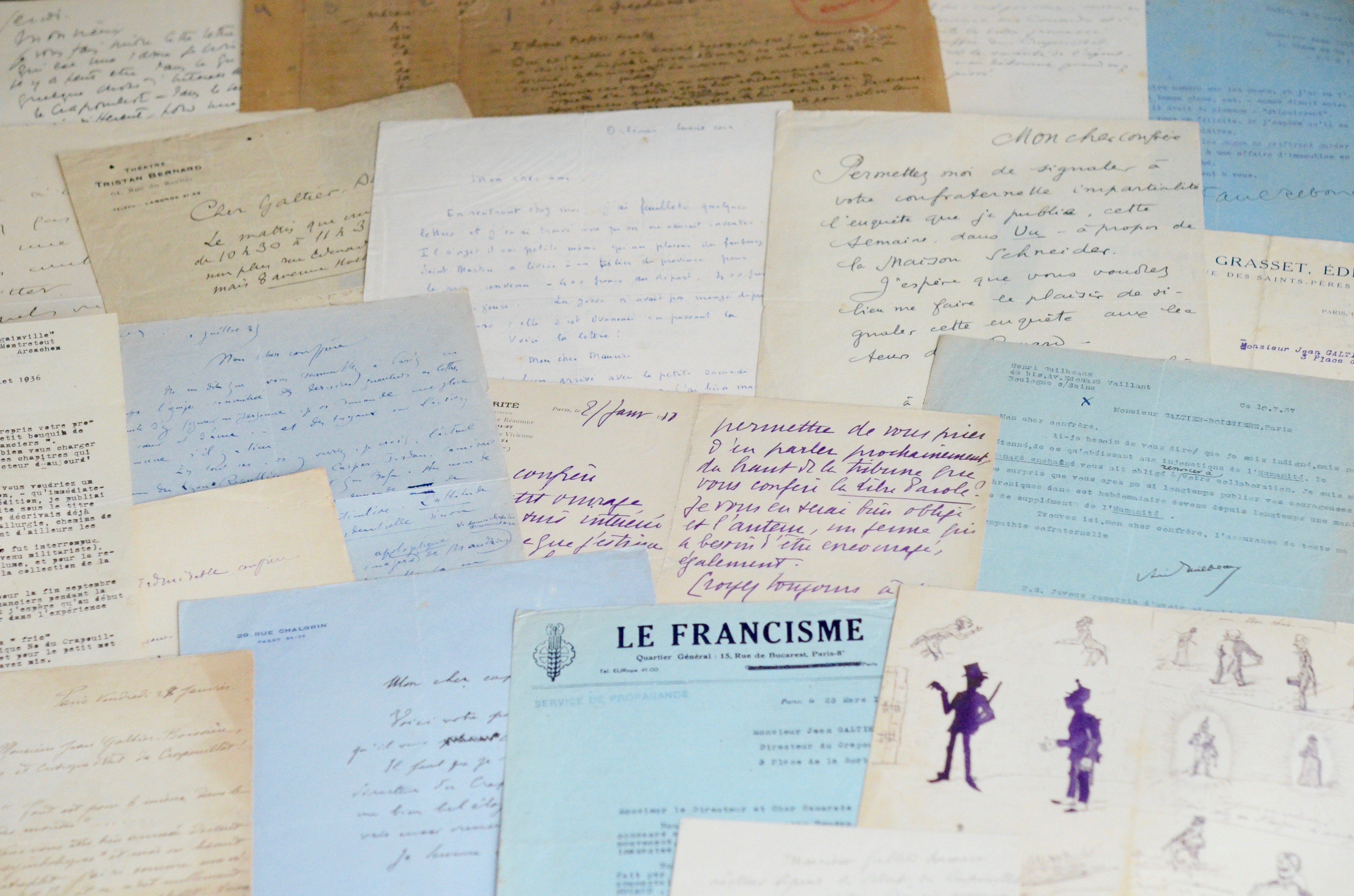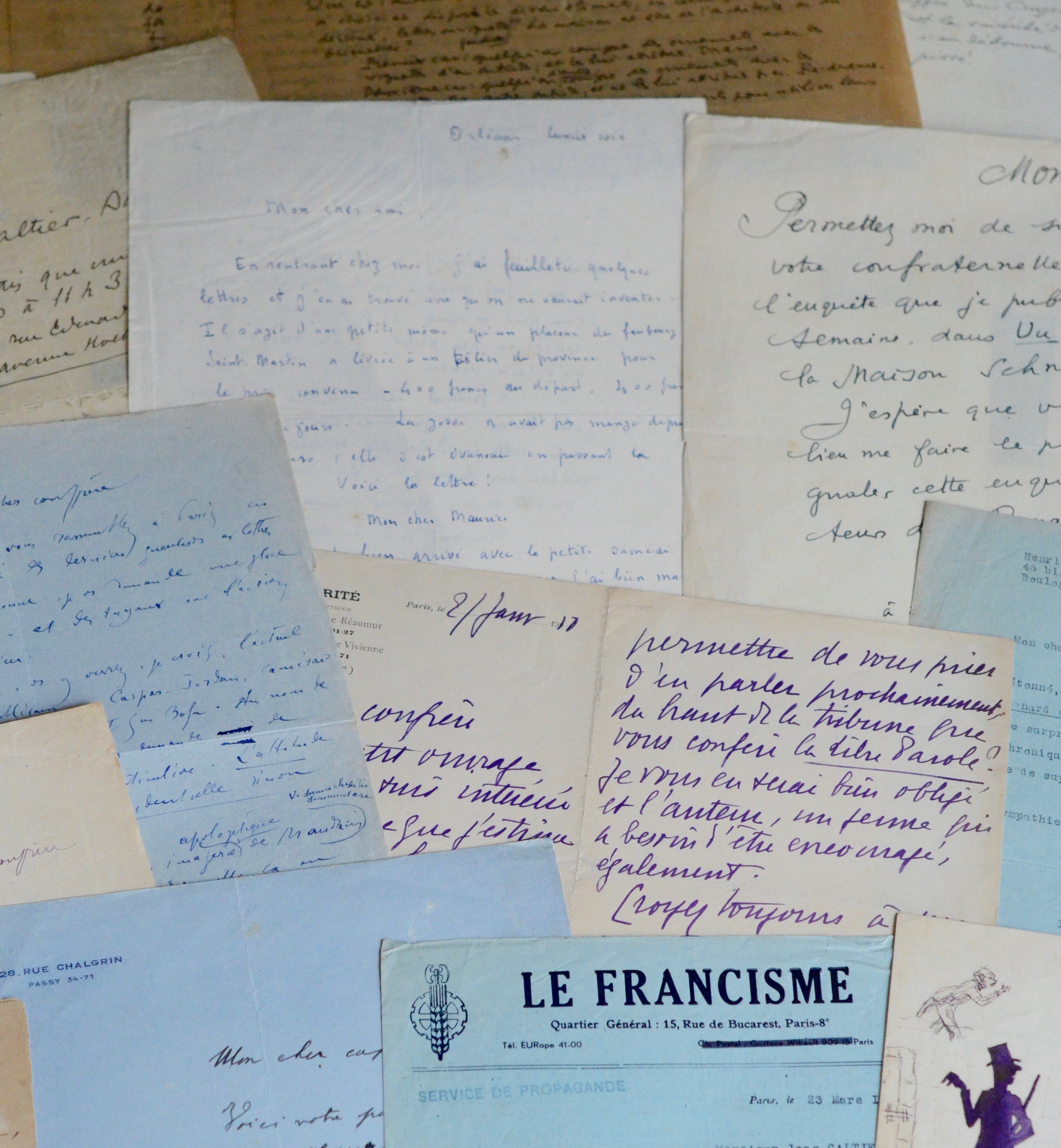 - 17 lettres adressées à Jean-Galtier-Boissière par Bernard Grasset, Gus Bofa (2), Tristan Bernard, Jacques Roberti, Paul Allard, le militant anarchiste et communiste Henri Guilbeaux (après l’éviction de JGB du Canard Enchaîné), Joseph Jolinon (2), Jane-Alice Caudron Chatry de la Fosse, Pierre Scize, Paul Lafitte, Paul Reboux, etc.
