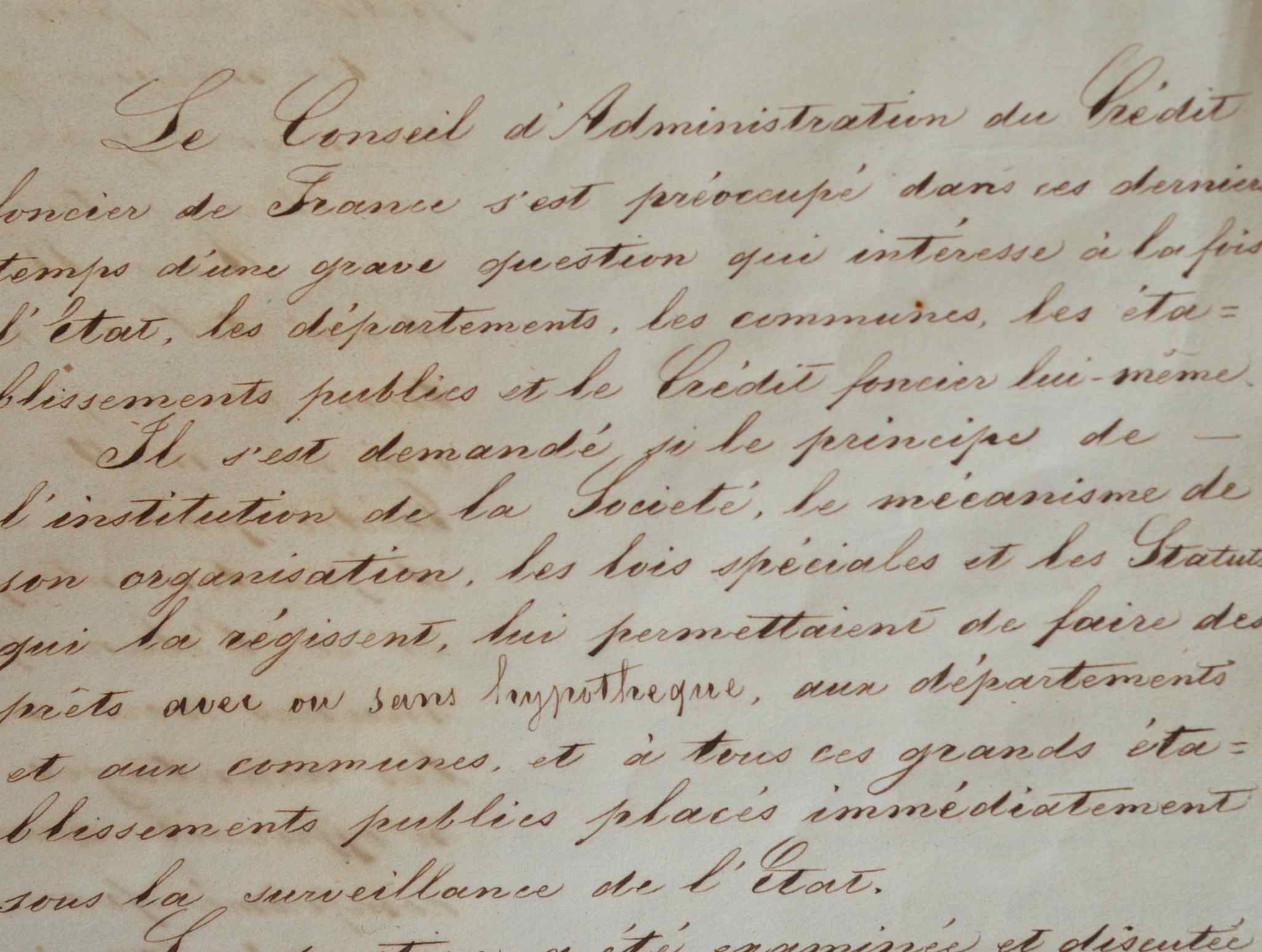 Copie d'époque d'une importante lettre des administrateurs du Crédit foncier de France (fondé en mars 1852 par Louis Wolowski) au ministre de l'Intérieur. L'établissement souhaite pouvoir financer les collectivités locales. Cette demande sera accueillie favorablement par la loi du 6 juillet 1860 ; le Crédit foncier devient alors un acteur essentiel aux côtés de l'État pour le financement de travaux publics, comme les travaux du Baron Haussmann à Paris : « [...] j'ai l'honneur de faire appel à Votre sollicitude, et cet appel je le fais autant au nom du Crédit foncier de France qu'en celui des Communes qui attendent avec impatience le moment où l'État, qui est leur tuteur, leur ouvrira le chemin de notre caisse. Le système de la libération par annuités leur offre des avantages incontestables. En effet, elles font journellement des emprunts considérables. Les pouvoirs législatifs ont autorisé de 1843 à 1852 des emprunts pour une somme de 196 500 000 francs et ce chiffre ne s'applique cependant qu'à des communes ayant plus de 100 000 francs de revenus, c'est-à-dire la grande minorité. Ces emprunts ne sont contractés souvent qu'avec des conditions onéreuses, des intérêts à 5%, quelquefois des lots et des primes. Les communes ne se libèrent ordinairement qu'à long terme après avoir payé de forts intérêts sans aucun amortissement du capital. [...] »