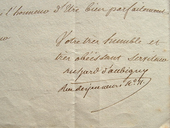 Lettre du cuisinier et agronome Richard d'Aubigny. Il s'excuse de ne pouvoir assister à la séance de la Société d'Agriculture (dont il est correspondant), étant atteint par des douleurs de goutte. «Mais tout malade que je suis, je ne puis cependant me deffendre de m'occuper encore de cuisine et d'économie. Je vois avec peine l'énorme consommation inutile qui se fait de bois et de charbon, et je désirerois avoir des données sur les moyens d'y remédier. En conséquence j'ai recours à vous et vous prie de m'indiquer parmi les constructions de fourneaux et cheminées pour cuisines, celles qui auront paru mériter le plus d'approbation et réunir le plus de perfections». Il demande son concours pour lui communiquer l'adresse des manufacturiers pour qu'il puisse leur rendre visite.