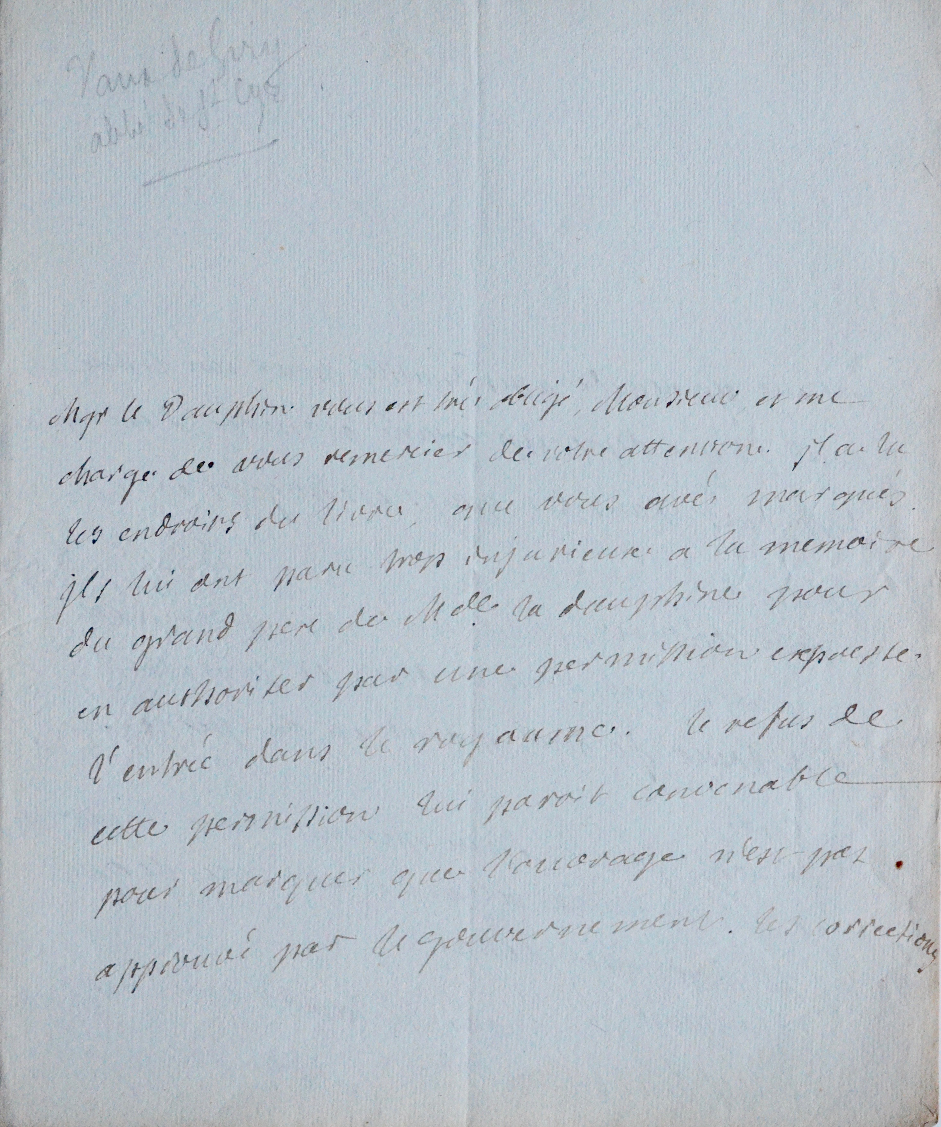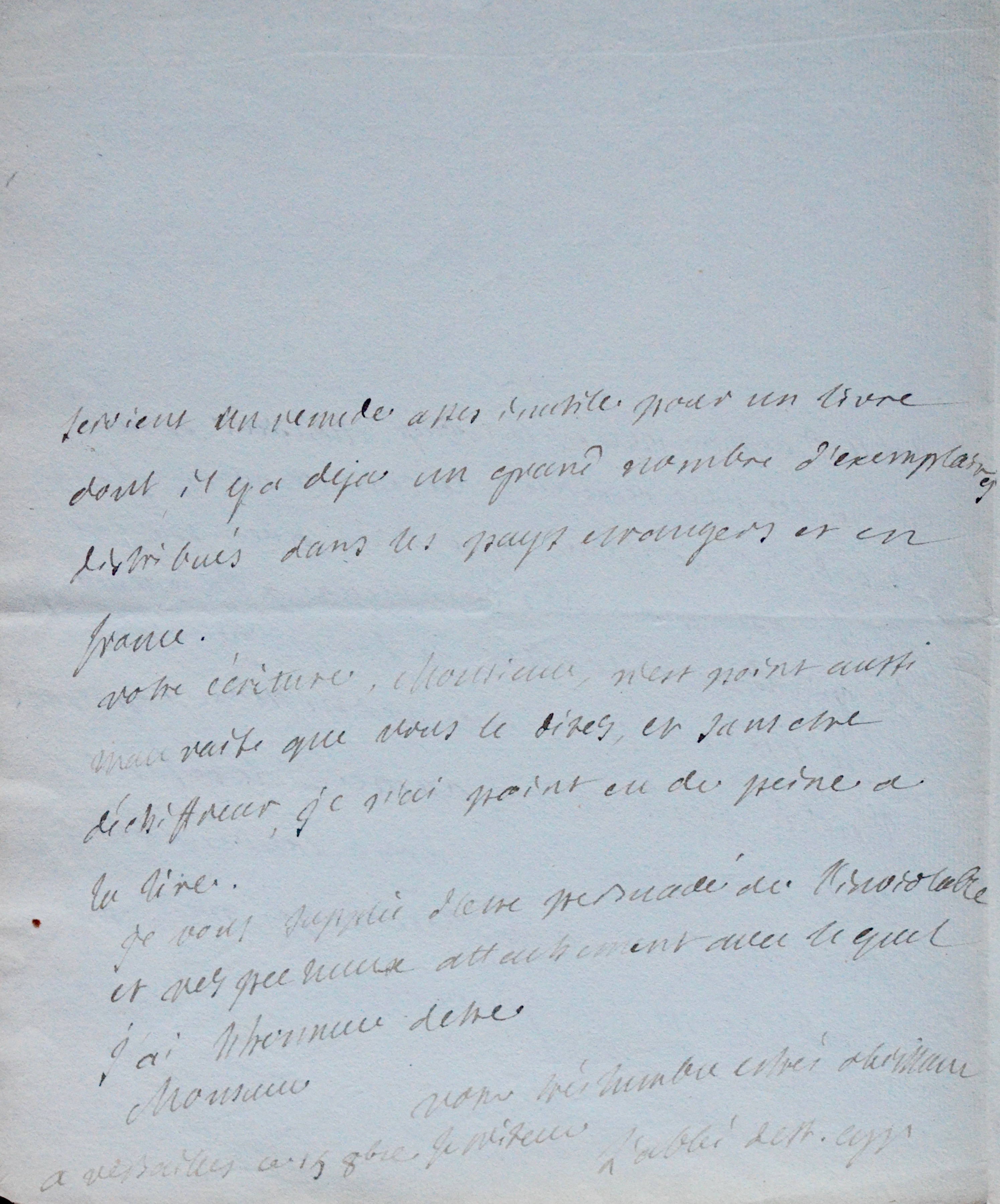 Au sujet d'un livre dont des passages ont déplu au Dauphin « […] j’ai lu les endroits du livre, que vous avés marqués. Ils lui ont paru trop injurieux a la mémoire du grand père de Mde la dauphine pour en authoriser par une permission expresse l'entrée dans le royaume. Le refus de cette permission lui paroit convenable pour marquer que l’ouvrage n’est pas approuvé par le gouvernement. Les corrections seroient un remede assez inutile pour un livre dont il y a déjà un grand nombre d’exemplaires distribués dans les pays étrangers et en France […] ». Il assure ensuite à son correspondant que son écriture n’est pas aussi indéchiffrable qu’il le dit.