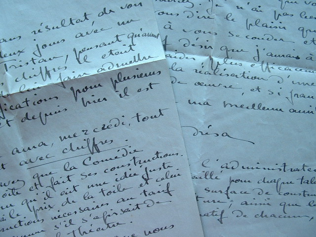 Deux lettres sur le même sujet : le chiffrage des décors pour Tristan et Iseut, vraisemblablement la version mise en scène au théâtre par Sarah Bernhardt, Joseph Bédier et Louis Artus, en 1929. «J'ai essayé, sans résultat, de voir Fabre il y a deux jours avec un projet pour Tristan [...] il aura, mercredi, tout mon projet avec chiffres. Vous savez que la comédie achète sa toile et fait ses constructions [...]. Je souhaite très fort que nous réussissions à faire jour cette oeuvre si noble et que j'admire de plus en plus à mesure que je la connais davantage». Il explique qu'il a chiffré les différents tableaux en tentant de compresser les dépenses au maximum. Avec enveloppe.