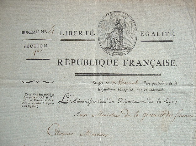 Lettre signée, pour copie conforme, par Honoré Vallé, président de l'administration du département de la Lys [Belgique] et Bouffé des Marais, secrétaire adjoint du Directoire exécutif. Ayant déjà fourni une grande quantité de vivres aux garnisons, le département se voit de nouveau frappé par une forte réquisition de 5500 quintaux de viande fraîche. Mais les administrateurs ne reconnaissent pas l'autorité du commissaire qui en a fait la demande ; si elle est vraiment formulée, ils veulent qu'elle le soit de manière officielle par les autorités centrales et que celles-ci en assurent le paiement. «Quant à la quantité de viande demandée à ce département, elle est évidemment exhorbitante. Il a rempli la dernière réquisition de bestiaux frappée sur lui, après tant d'autres, après tous les malheurs de la guerre dont il a été longtemps le théâtre, touchant à l'ancienne frontière. Nous fournirons ce que nous pouvons fournir. Quant au moyen de paiement, il faut le déterminer d'une manière précise et propre à en garantir la certitude [...]. La réquisition nouvelle de bestiaux ne se remplira pas si ce payement n'est pas réglé d'une manière positive. Les cultivateurs ne sont pas encore payés des prestations militaires faites pendant que la grande armée était ici, c'est à dire depuis plus de deux ans [...]».