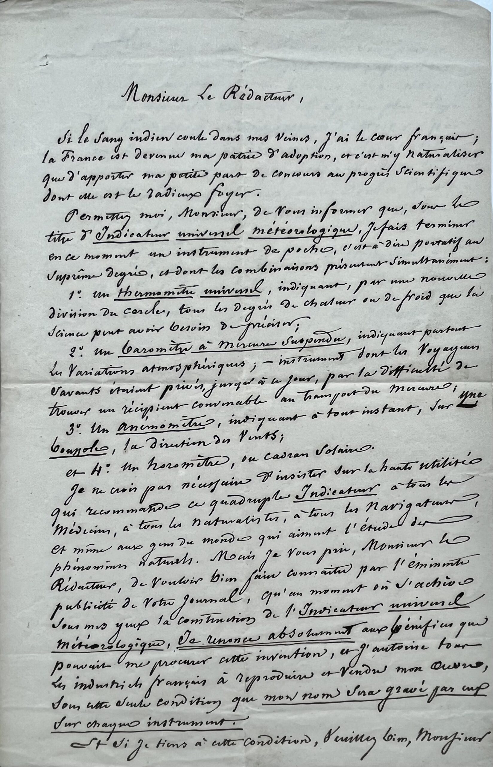 "Monsieur Le Rédacteur. Si le sang indien coule dans mes veines, j’ai le cœur français ; la France est devenue ma patrie d’adoption, et c’est m'y naturaliser que d’apporter ma petite part de concours au progrès scientifique dont elle est le radieux foyer. Permettez-moi, Monsieur, de vous informer que, sous le titre d’Indicateur universelle météorologique, je fais terminer en ce moment un instrument de poche, c’est-à-dire portatif au suprême degré, et dont les combinaisons présentent simultanément :