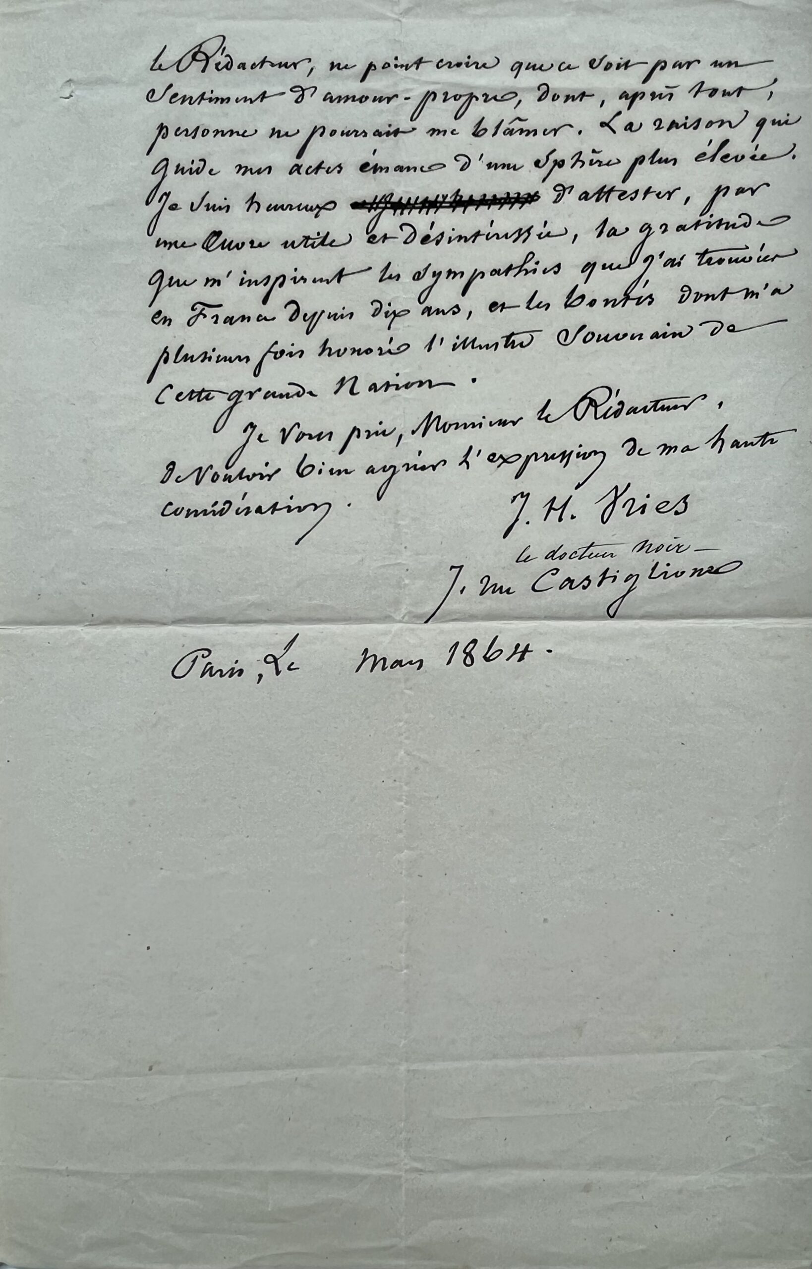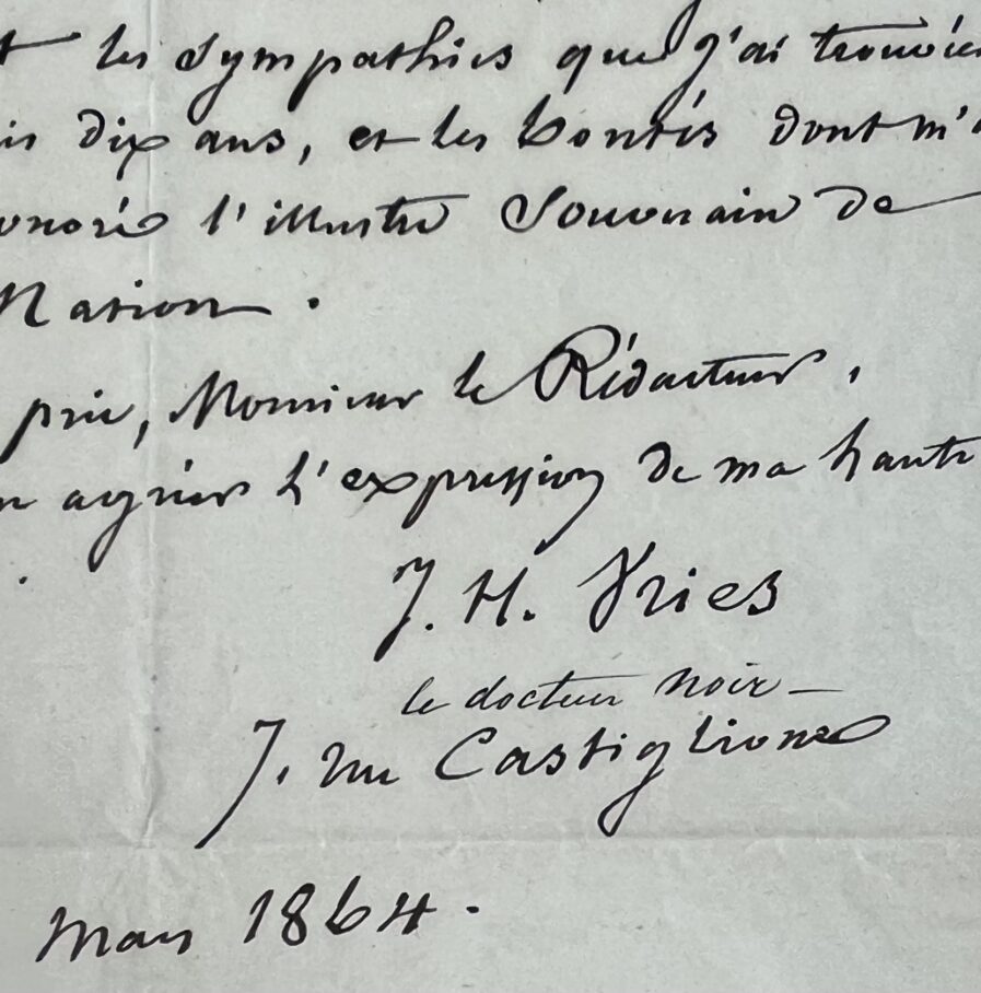 Jan Hendrick Vriès dit le "Docteur Noir" (Surinam, ?/?)Type de document : lettre autographe signée