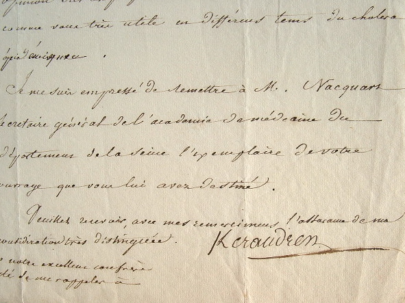 Keraudren commente l'ouvrage sur le Cholera Morbus de son correspondant : "Les nombreux succès que vous avez obtenus sont très remarquables et les bons effets que vous avez retirés de l'esprit de Minderer ne le sont pas moins. Je partage toutefois votre opinion sur les propriétés de ce médicament, je le crois comme vous très utile en différents tems du choléra épidémique [...]". Il a fait remettre l'exemplaire à l'Académie de médecine.