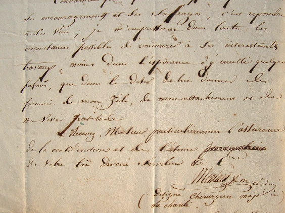 Montain, alors chirurgien major à la Charité de Lyon, vient de recevoir sa nomination de correspondant de la Société des Sciences, arts et belles-lettres de Mâcon. "Convaincu que faire ses efforts pour mériter ses encouragements et ses suffrages, c'est répondre à ses vues, je m'empresserai dans toutes les circonstances possibles de concourir à ses intéressants travaux, moins dans l'espérance d'y cueillir quelques palmes, que dans le désir de lui donner les preuves de mon zèle, de mon attachement et de ma vive gratitude [...]". Il est joint un papier à son en-tête.