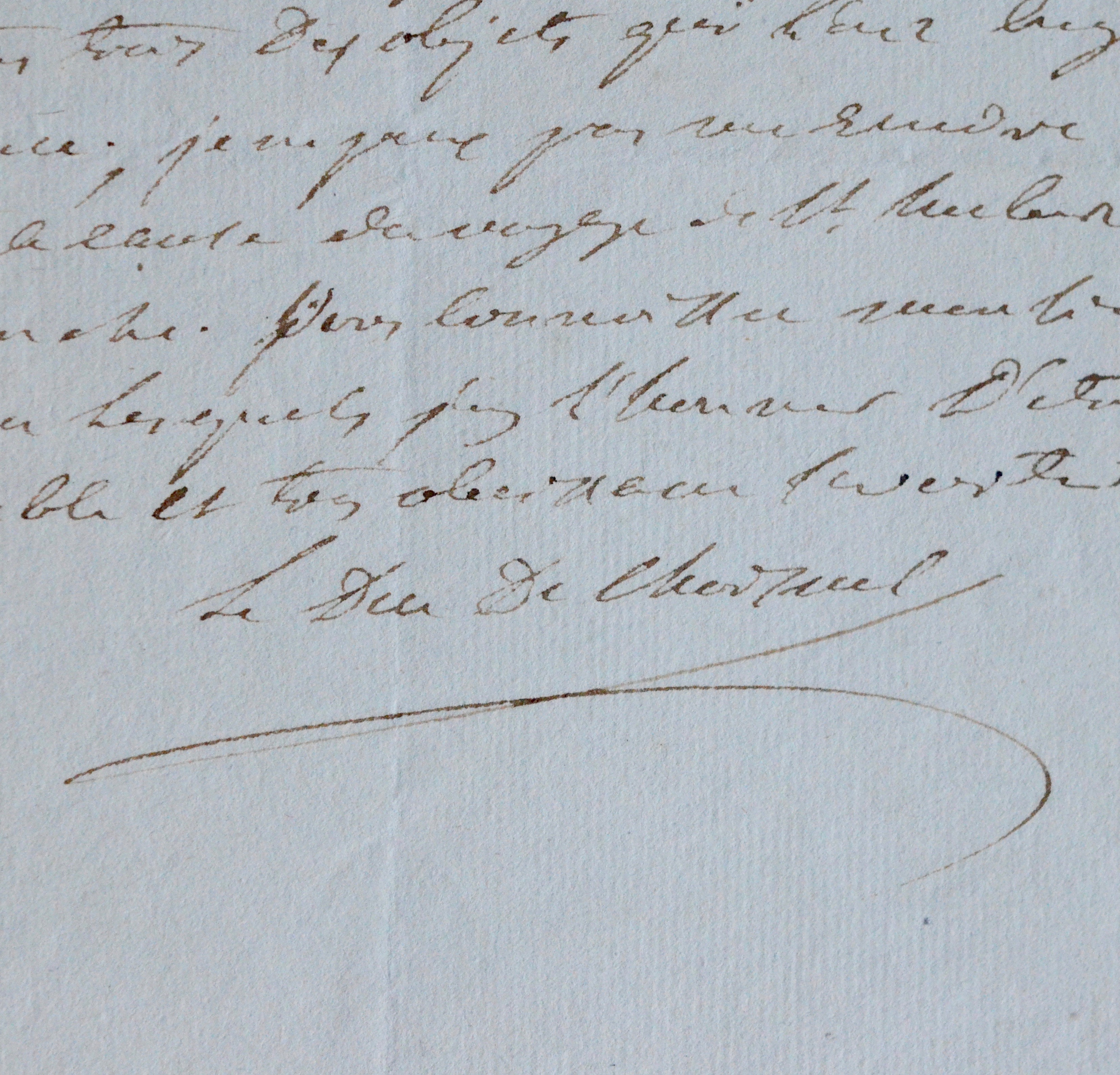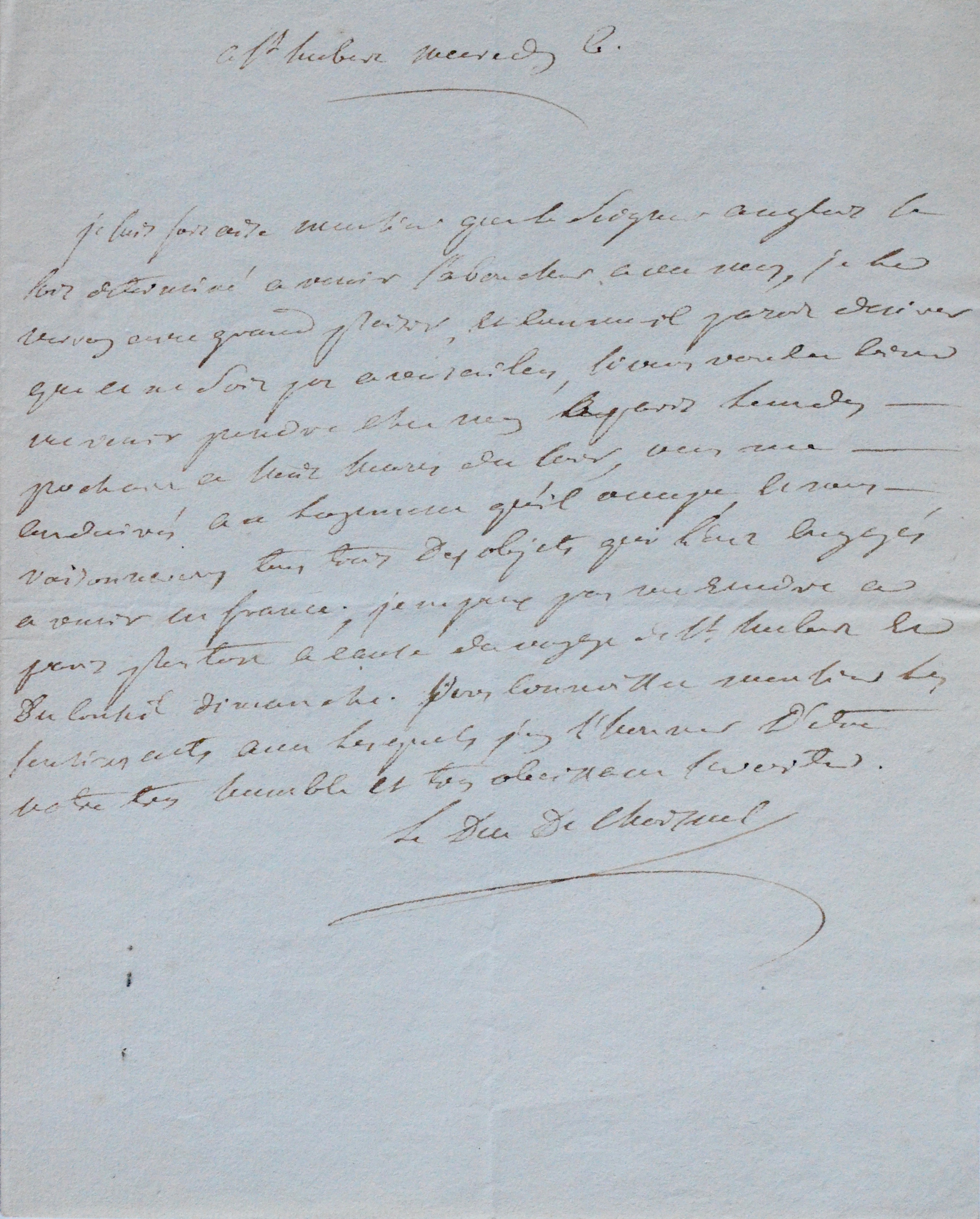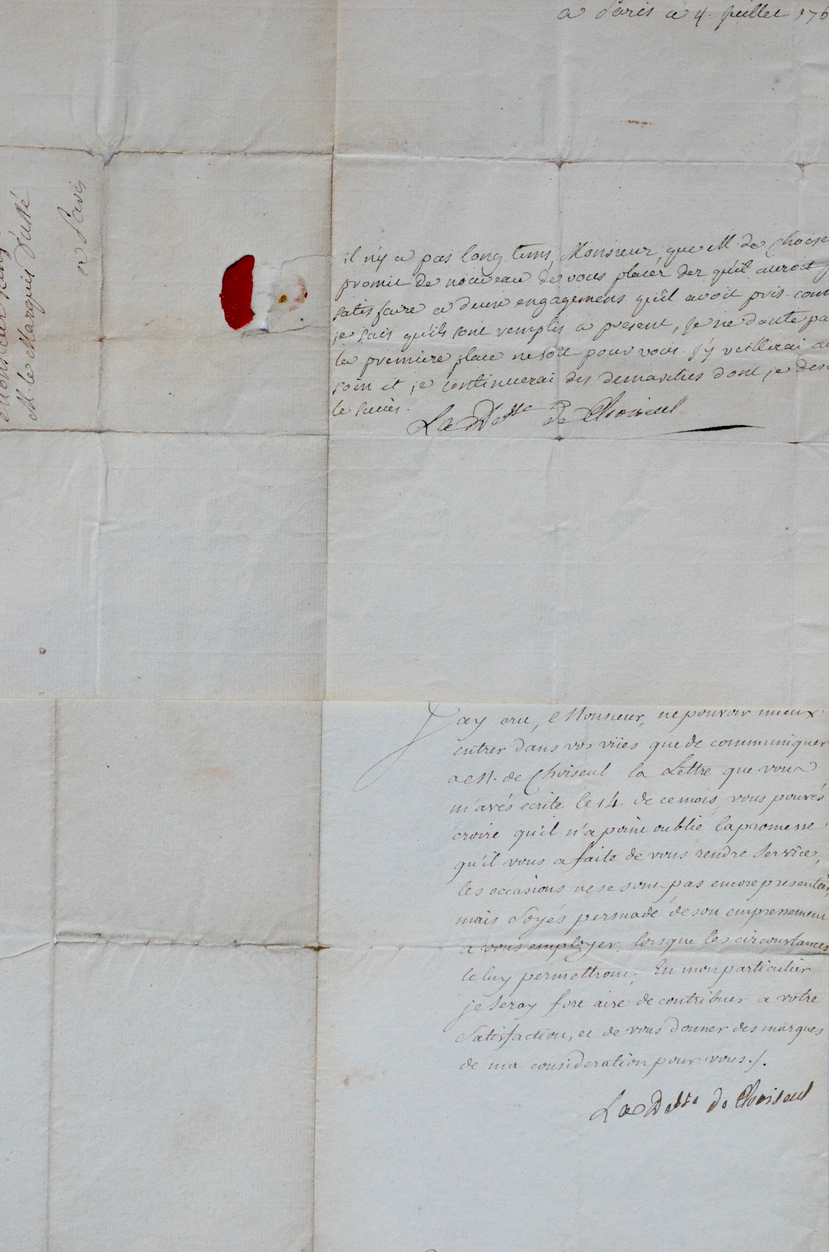 Etienne François Choiseul, duc de (1719/1785)Lettre entièrement autographe du duc de Choiseul, accompagnée de 2 lettres de la duchesse.