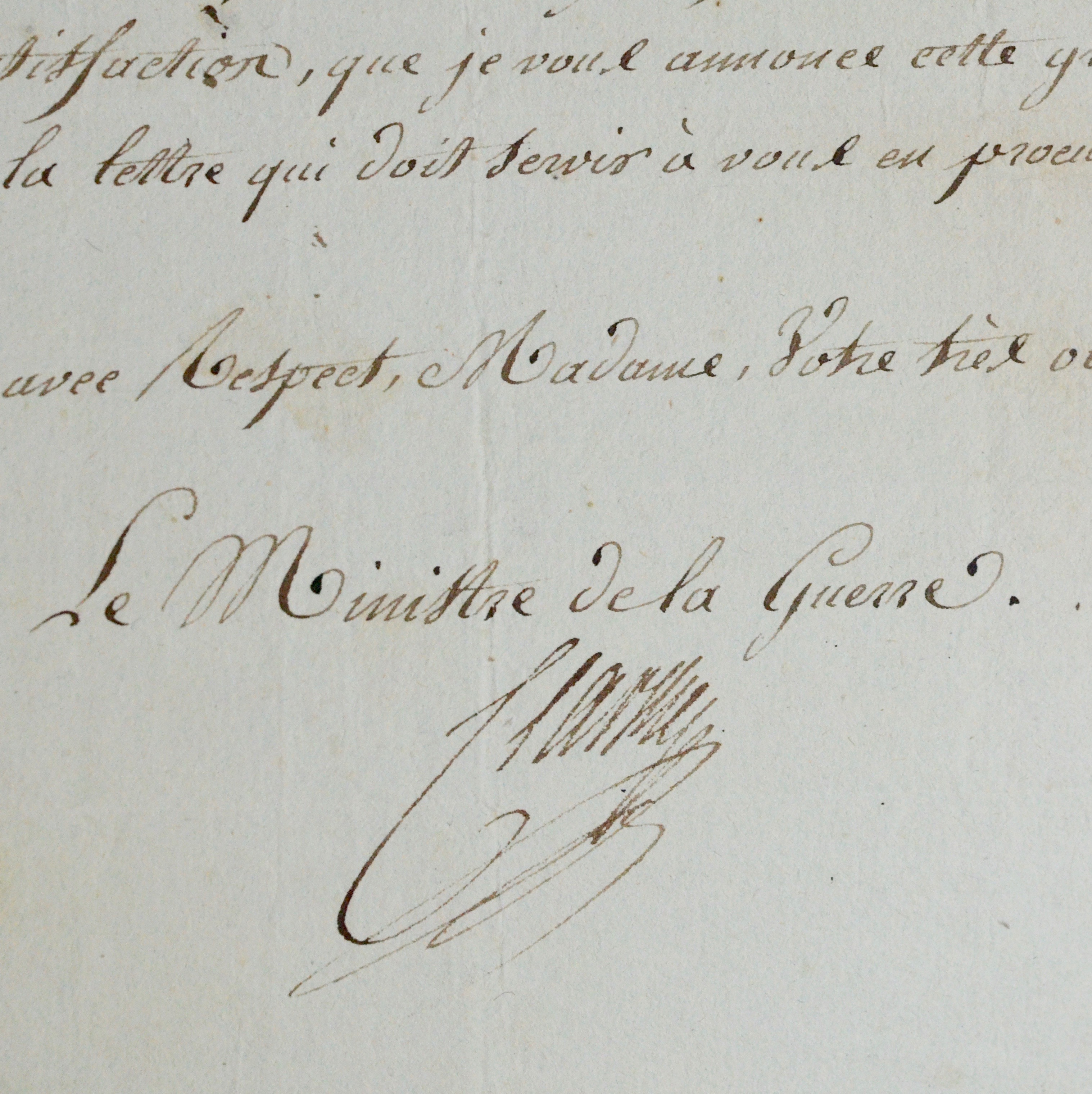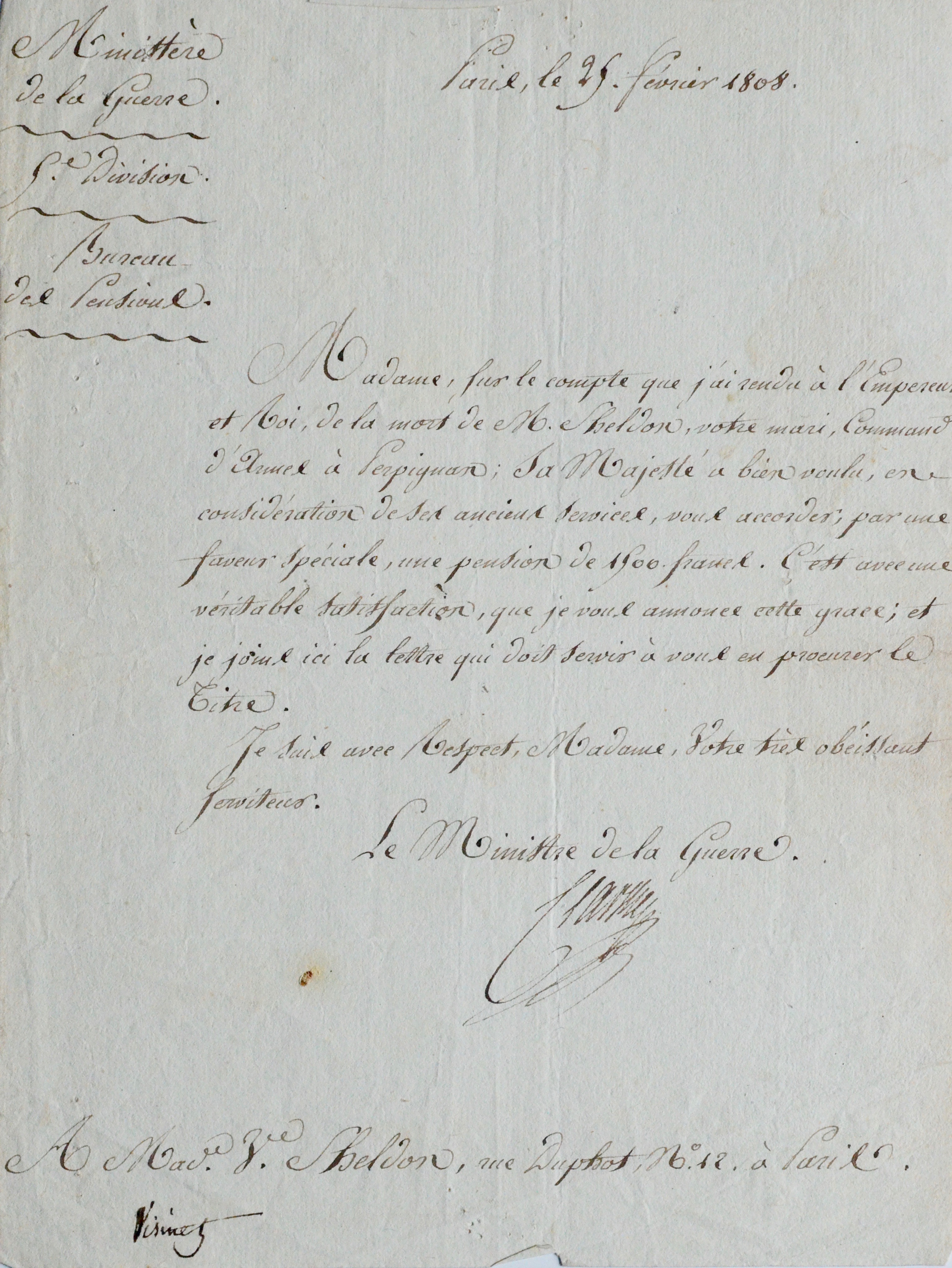 "Sur le compte que j'ai rendu à l'Empereur et Roi, de la mort de M. Sheldon, votre mari, commandant d'armes à Perpignan ; Sa Majesté a bien voulu, en considération de ses anciens services, vous accorder, par une faveur spéciale, un pension de 1500 francs. C'est avec une véritable satisfaction, que je vous annonce cette grâce [...]".