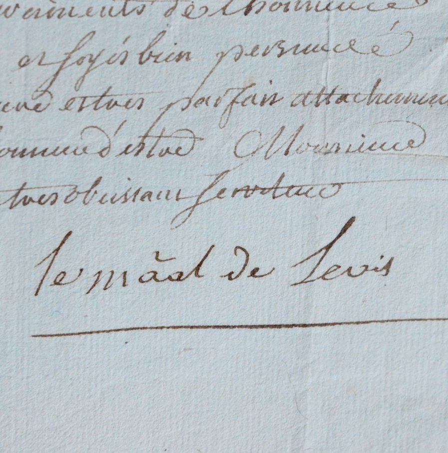 Fraîchement élevé au grade de maréchal de France, François-Gaston de Lévis remercie chaudement son correspondant pour la part qu’il a prit à cette promotion et ajoute « je me rappelle avec plaisir le temps où par vos bons services vous avez contribué au mérite des miens ».