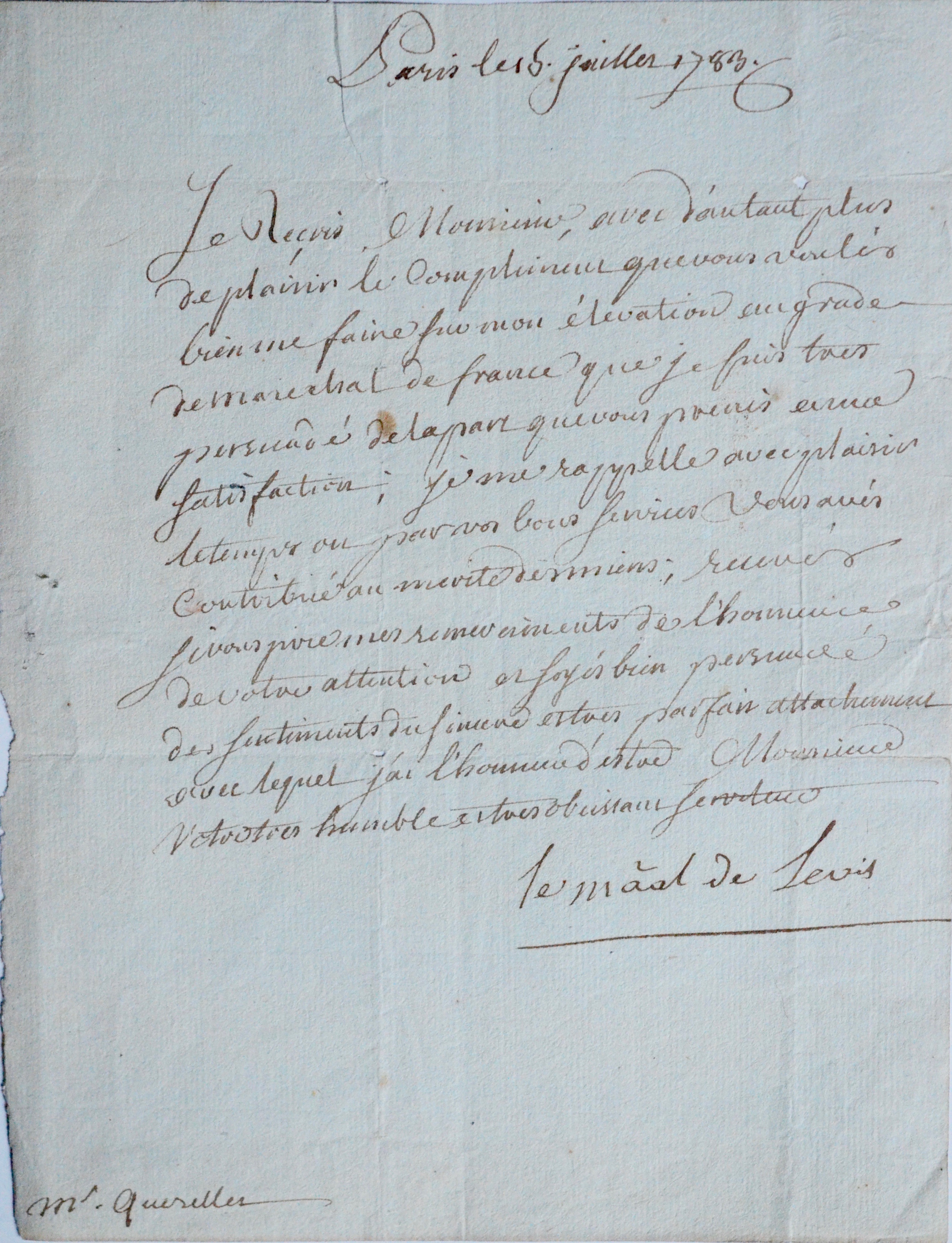 Lettre signée du Maréchal de Lévis, adressée à « M. Querellet ».