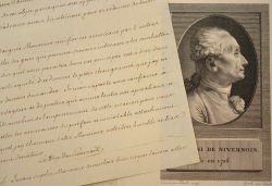Louis Jules Mancini Mazarini, duc de Nivernais (Paris, 1716/1798)Dans cette lettre, le duc de Nivernais souhaite la modification du « Chemin de Poitiers » et s'en explique : « 1° On convient que l'intérêt du Public doit toujours être préféré à celui des particuliers quelconques ; mais on ose affirmer que cette maxime n'est pas applicable au cas dont il s'agit parce que le changement qu'on demande dans la direction du nouveau chemin de Poitiers à Limoges ne regarde que l'espace compris entre Poitiers et Mignalon, espace d'environ une lieue, et que ce changement serai absolument indifférent au Public. 2° On a l'honneur de vous assurer en connaissance de cause que ce qui peut être déjà commencé dans cette partie est si peu de chose qu'il doit être compté pour rien. » Le « Chemin de Poitiers » - pour le pèlerinage de Saint-Gilles - reliait cette ville à Saint-Gilles-du-Gard, en passant par Aurillac, Laguiole, Aubrac, etc. On joint un portrait gravé du duc d'après Predelli.