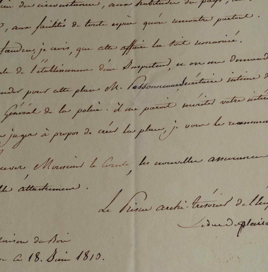 Le duc de Plaisance se plaint du service de la poste aux chevaux. «La poste aux chevaux, monsieur le comte, est assez mal établie dans ce pays-ci, les voyageurs se plaignent et les maîtres de poste aussi. Cela tient à bien des circonstances, aux habitudes du pays, au mauvais état des routes, aux facilités de toutes espèces qu'on rencontre partout. Il faudra, je crois, que cette affaire là soit remaniée. On parle de l'établissement d'un inspecteur et on me demande de vous recommander pour cette place M. Pessonneux, secrétaire intime de M. le directeur général de la Police [...]».
