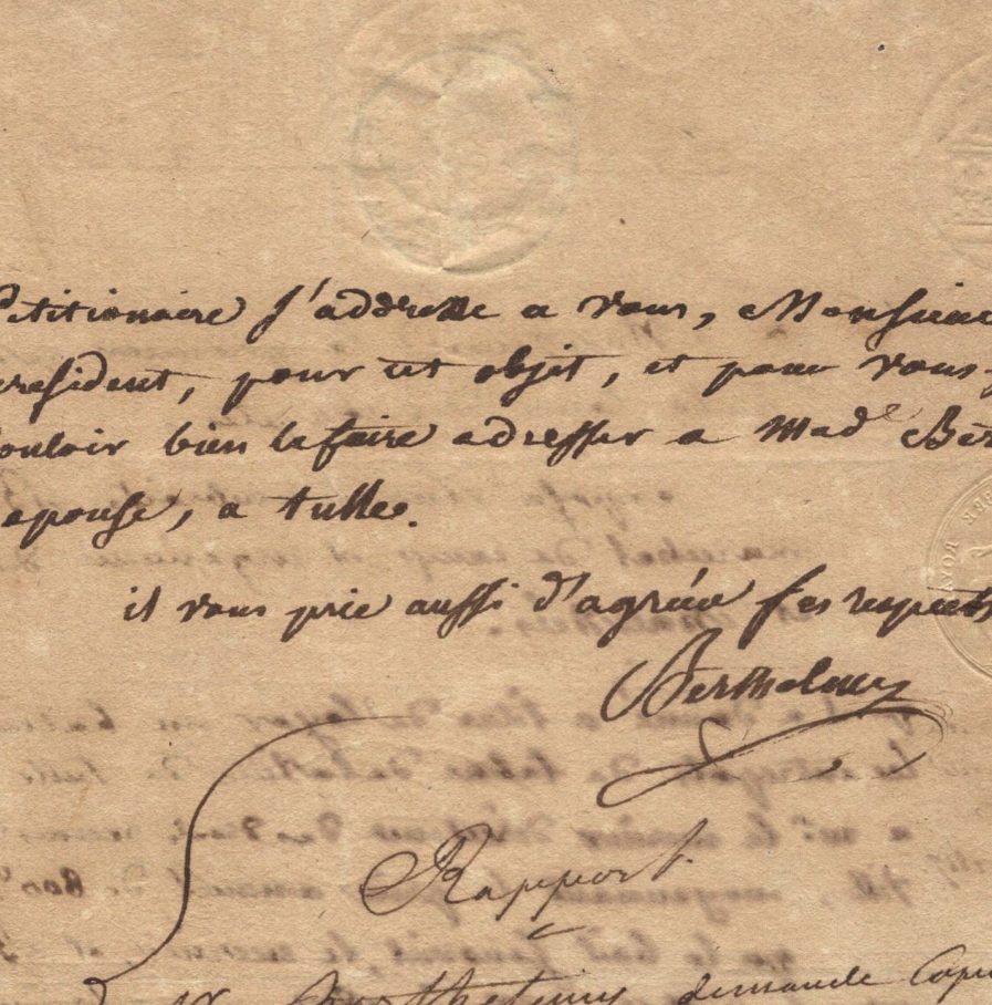 Requête du général Berthelmy au premier président de la Cour des comptes, relative au bâtiment qu'il loue à la ville de Tulle, pour l'entrepôt des tabacs, depuis 1812. Il demande à ce qu'il lui soit délivré un double du contrat.