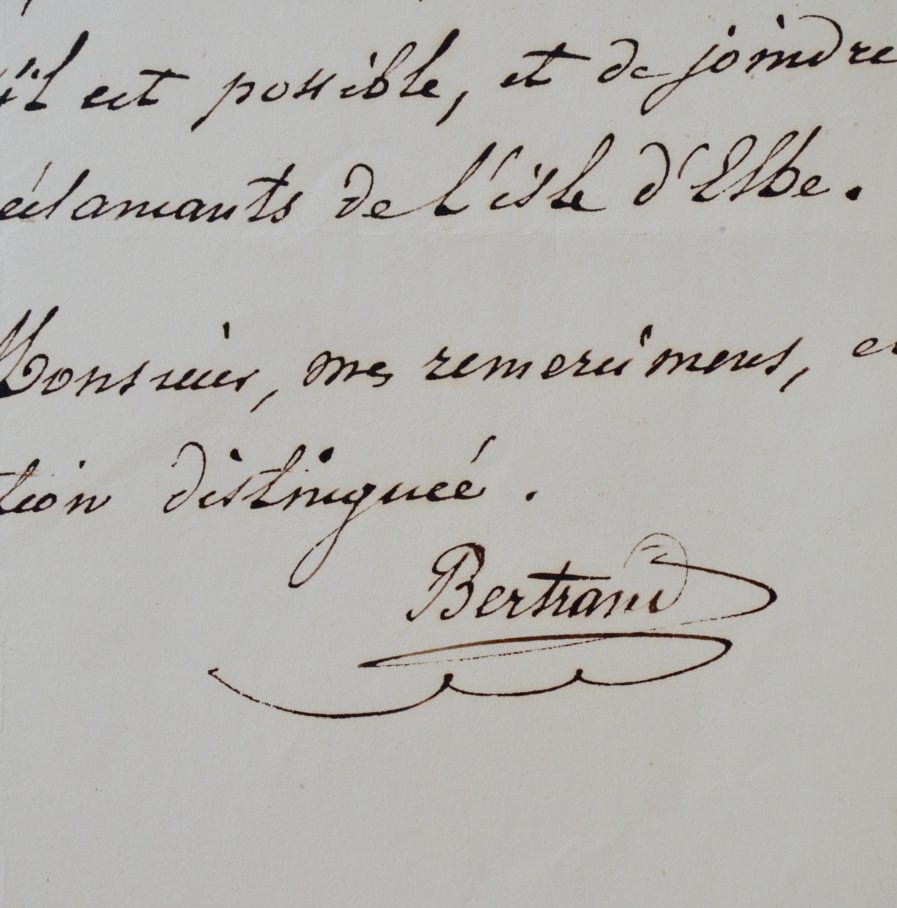 Henri Gatien Bertrand (comte) (Châteauroux, 1773/1844)Lettre du Général Bertrand dans laquelle il évoque une "liste des réclamations de l'Isle d'Elbe".