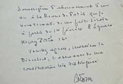 Après l'écriture d'un article sur le Moyen-Orient publié dans la Revue de Paris. « Je n'avais pas envisagé qu'il fut l'objet d'une rémunération. L'honneur de paraître dans la Revue de Paris, me suffisait. Or, vos services m'ont fait parvenir un chèque de 7000 f. [...]. Je me permets de vous en retourner une partie sous la forme d'une souscription d'abonnement d'un an à la Revue de Paris [...] ».