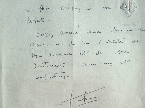 Lettre adressée au Gouverneur du Tchad, Henry de Mauduit. Le général répond qu'il ne pourra se rendre à : Dakar comme prévu : «Je viens d'apprendre le report des cérémonies de Ft Lamy à février. Par suite, il ne me sera pas possible d'être des vôtres [...]».