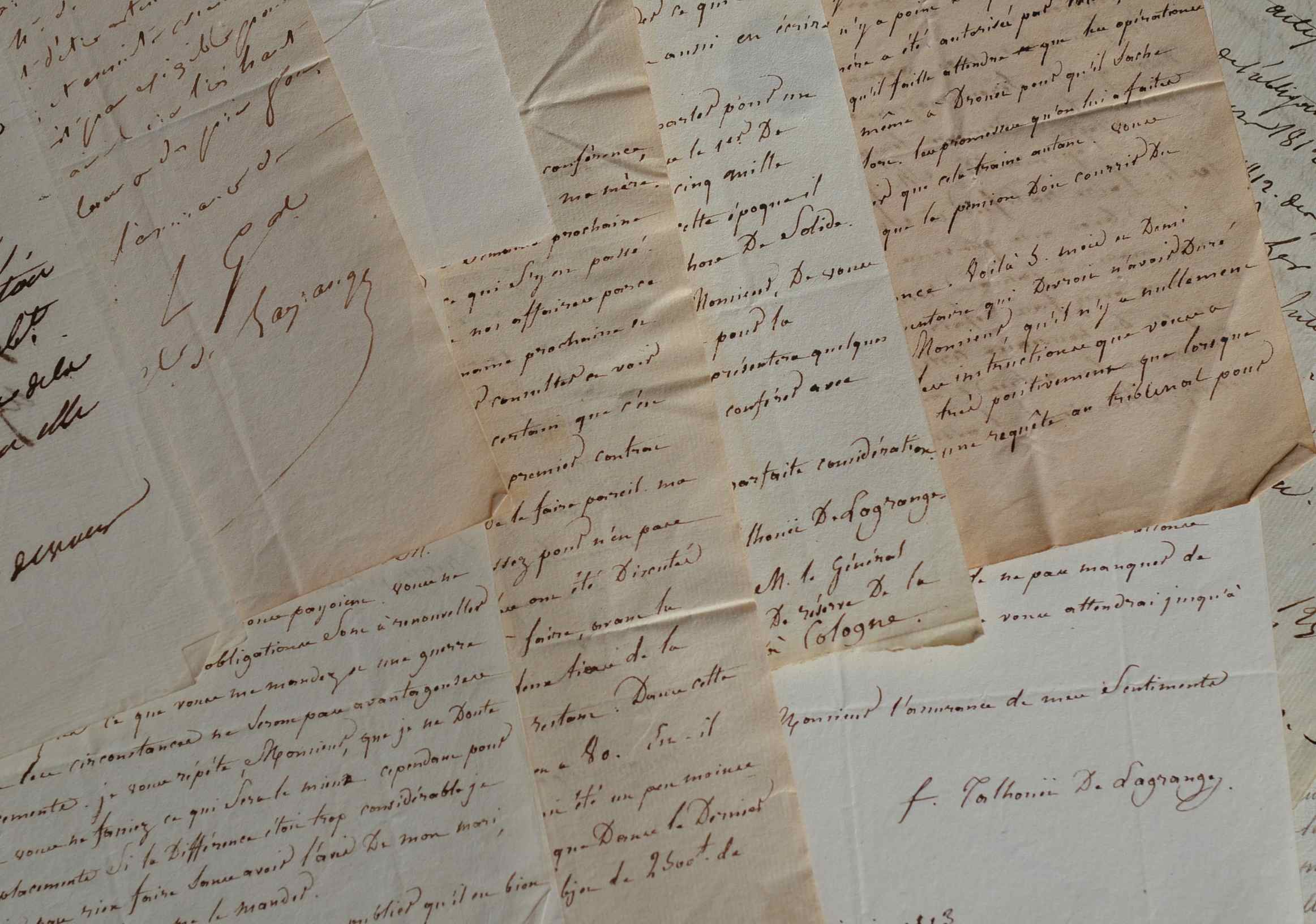 Important dossier composé d'une L.A.S. du comte Joseph Lagrange (1811) accompagnée d'un reçu autographe signé du même, de huit L.A.S. de la comtesse Marie Talhouët-Lagrange, d'une L.A.S. de M. Chevrier, notaire, un Etat des recettes pour le Comte de Lagrange par M. Chevrier, un détail manuscrit des comptes du Comte de Lagrange, un rapport des commissaires dans l'arbitrage de l'affaire, une copie manuscrite du bordereau des dépenses du Comte de Lagrange établi par M. Brocheton. Cette affaire oppose sur plus de deux décennies le Comte et la Comtesse de Lagrange à M. Chevrier, notaire, pour l'admission d'une créance, ainsi que l'achat et la vente d'obligations. Elle témoigne de la situation financière et de son évolution dans la noblesse de l'Empire au cours des premières décennies du XIXe siècle.