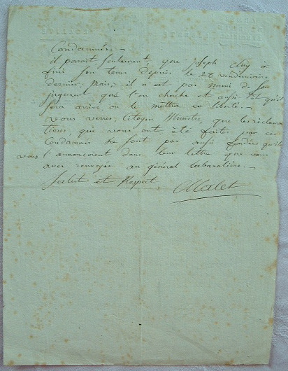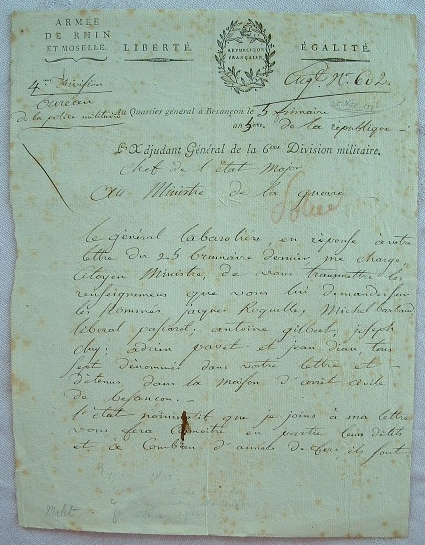 Chargé de transmettre des renseignements sur plusieurs détenus de la prison de Besançon (par le général Labarolière), il adresse un état nominatif indiquant leur condamnation. «Vous verrez, citoyen ministre, que les réclamations qui ont été faites par ces condamnés ne sont pas aussi fondées qu'ils vous l'annonçaient dans leur lettre que vous avez envoyée au général Labarolière».