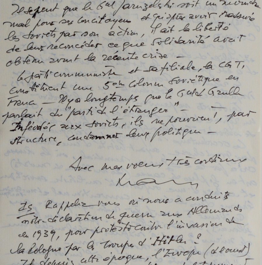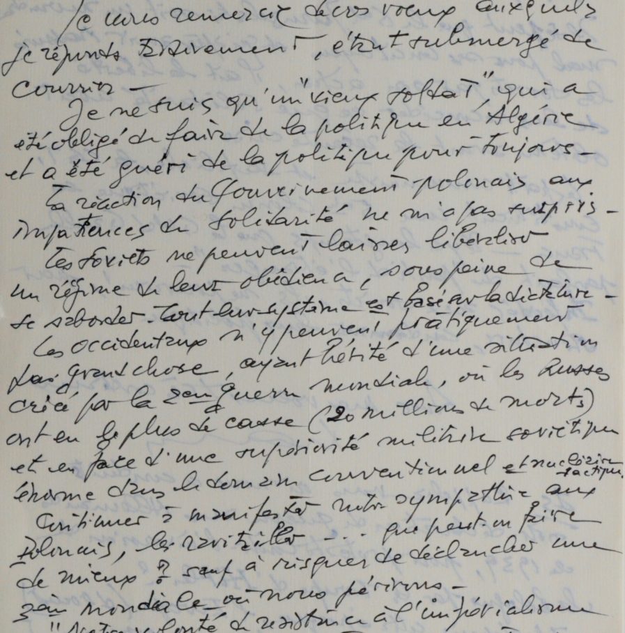 "[...] Je ne suis qu'un "vieux soldat", qui a été obligé de faire de la politique en Algérie et a été guéri de la politique pour toujours. La réaction du gouvernement polonais aux impatiences de Solidarité ne m'a pas surpris. Les Soviets ne peuvent laisser libéraliser un régime de leur obédience, sous peine de le saborder - tout leur système est basé sur la dictature. Les occidentaux n'y peuvent pratiquement pas grand chose, ayant hérité d'une situation créée par la 2eme Guerre Mondiale, où les russes ont eu le plus de casse (20 millions de morts) et en face d'une supériorité militaire soviétique [...]". A part continuer de témoigner de la sympathie, Massu ne sait pas quoi faire, pour ne pas "risquer de déclencher une 3éme [guerre] mondiale où nous périrons". Il évoque l'impérialisme soviétique, la Sibérie, le général Wojciech Jaruzelski, le parti communiste et sa filiale Française : la CGT ; Hitler et la guerre de 1932, etc.