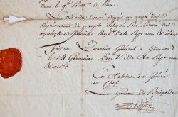 Ordre signé par le général Piston, à la place du général en chef commandant l'armée des Alpes, Thomas-Alexandre Dumas. «Il est ordonné au citoyen Berriat dit St Prix de se rendre au reçu du présent ordre à Commune Affranchie pour y exercer la place de Quartier M[aît]re dans le 9e bataillon de l'Isère. Le dit ordre donné d'après un arrêté des représentants du peuple délégués près l'armée des Alpes le 13 germinal an 2 [...]». [Jacques Berriat Saint-Prix (Grenoble 1769/1845), jurisconsulte, membre de l'Institut, a présidé à la reconstitution de l'ancienne Académie Delphinale].