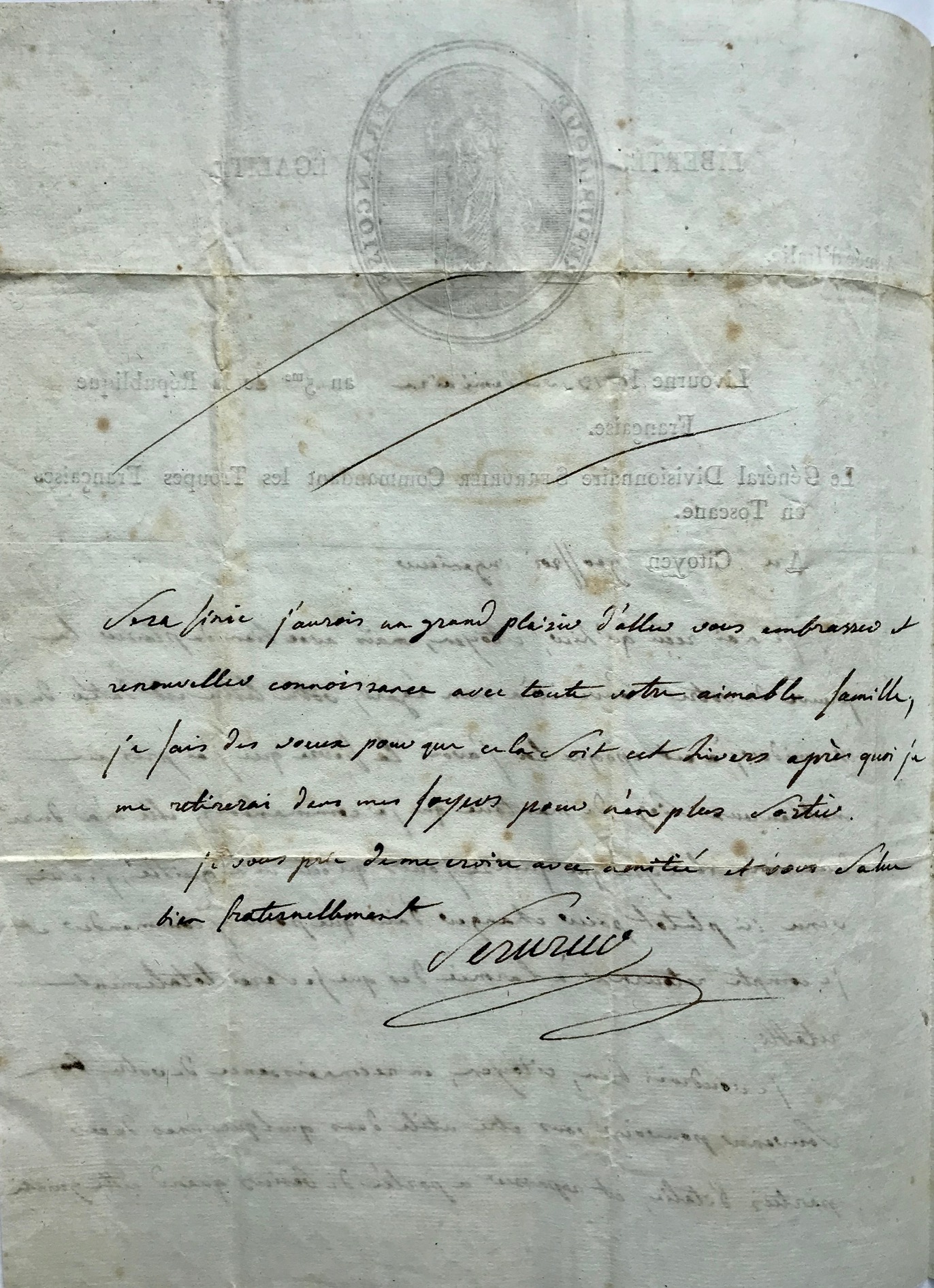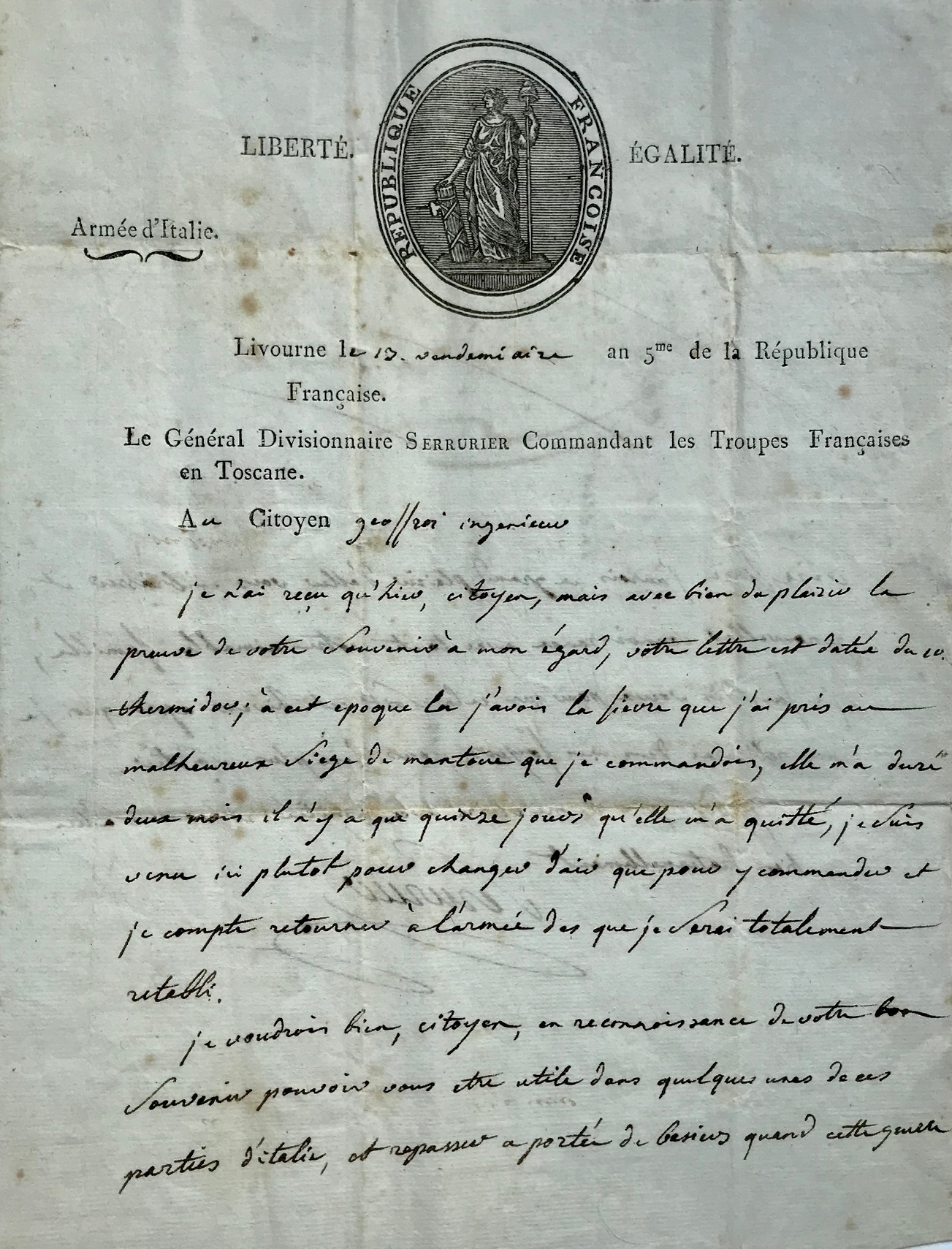Il reçoit un courrier tardivement, qui fut rédigé à une époque ou il était malade "j'avois la fièvre que j'ai pris au malheureux siège de Mantoue que je commandais, elle m'a duré deux mois [...]. Je suis venu ici plutôt pour changer d'air que pour y commander et je compte retourner à l'armée dès que je serai totalement rétabli [...]". Il espère revoir son ami et la famille de ce dernier "cet hiver après quoi je me retirerai dans mes foyers pour n'en plus sortir".