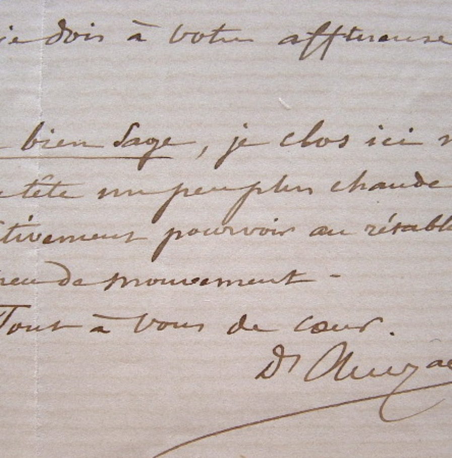 D'avezac est très souffrant et ne peut prendre la plume qu'avec parcimonie. «Je vous remercie avec effusion du secours que votre amitié est venue me prêter pour mettre en temps opportun à la disposition de M. Amédée Tardieu l'analyse de mon étude chronologique sur Colomb, destinée aux comptes-rendus de notre Académie [des inscriptions]. Merci également pour la remise à M. Maunoir, avec les recommandations convenables, de mon manuscrit, afin de continuer l'impression commencée [...]». (En 1873, d'Avezac publie le Livre de Ferdinand Colomb).