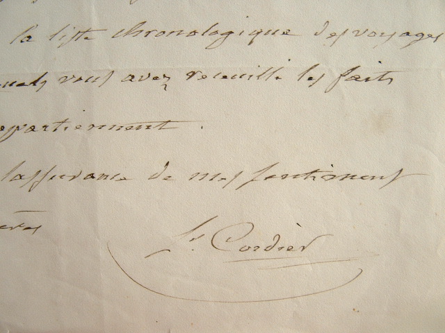 «Je désirerais aussi avoir les dates de vos diverses observations, c'est à dire les années pendant lesquelles vous avez été dans chaque pays. Je vois par exemple que c'est en 1836 que vous avez été au Sénégal, mais je ne trouve pas l'époque à laquelle vous avez été à Cayenne. Il en est de même de vos recherches dans le Jura et sur les côtes françaises [...]».