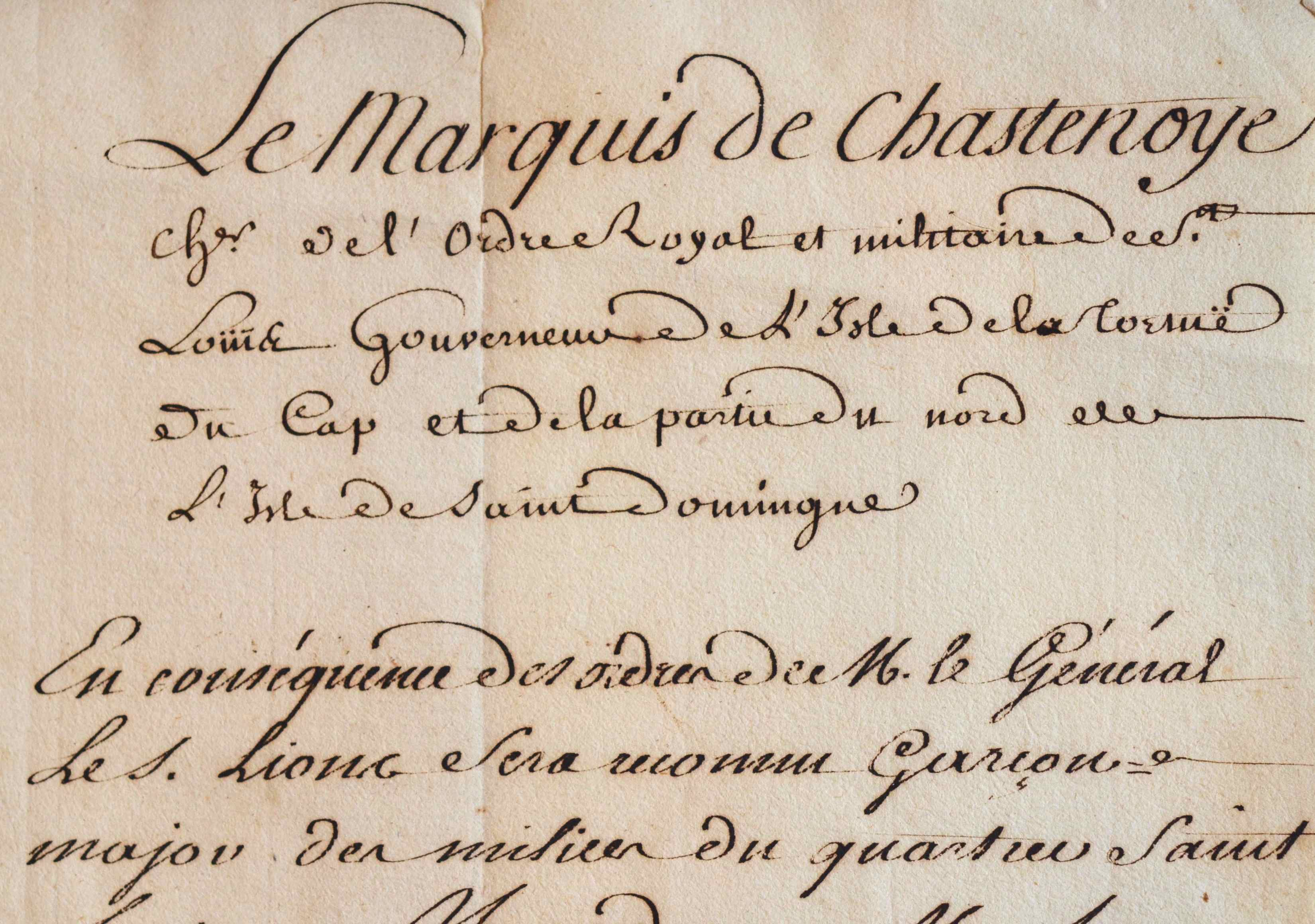 Rare pièce signée par Achille de Cochart, marquis de Chastenoye (1703/1787), "gouverneur de l'Isle de la Tortue, du Cap et de la partie nord de l'Isle de Saint-Domingue". Suivant les ordres du général, il nomme le sieur Lions, "garçon major des milices du quartier Saint-Louis". [L'île de la Tortue fut longtemps un repaire de pirates, bastion des flibustiers et boucaniers].