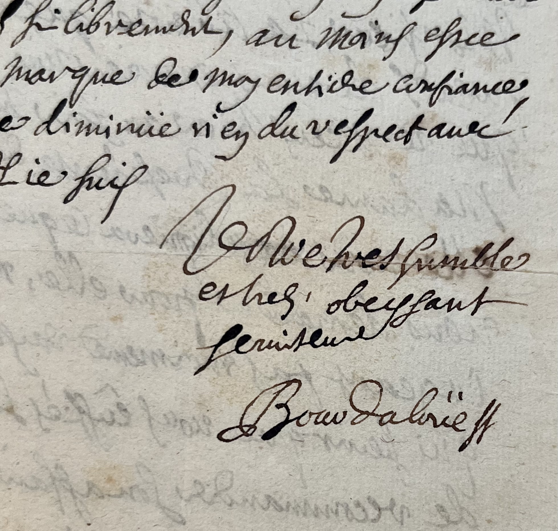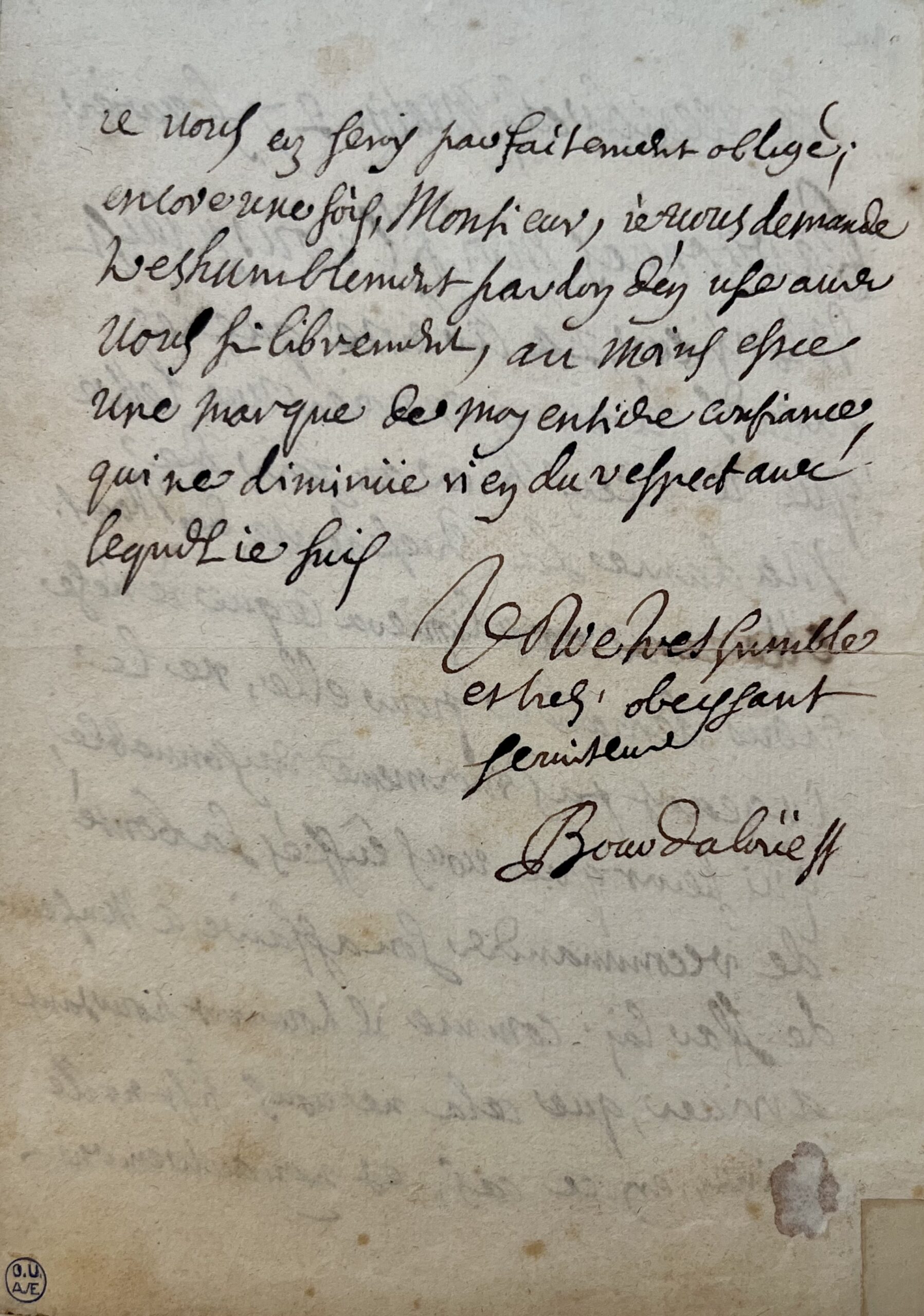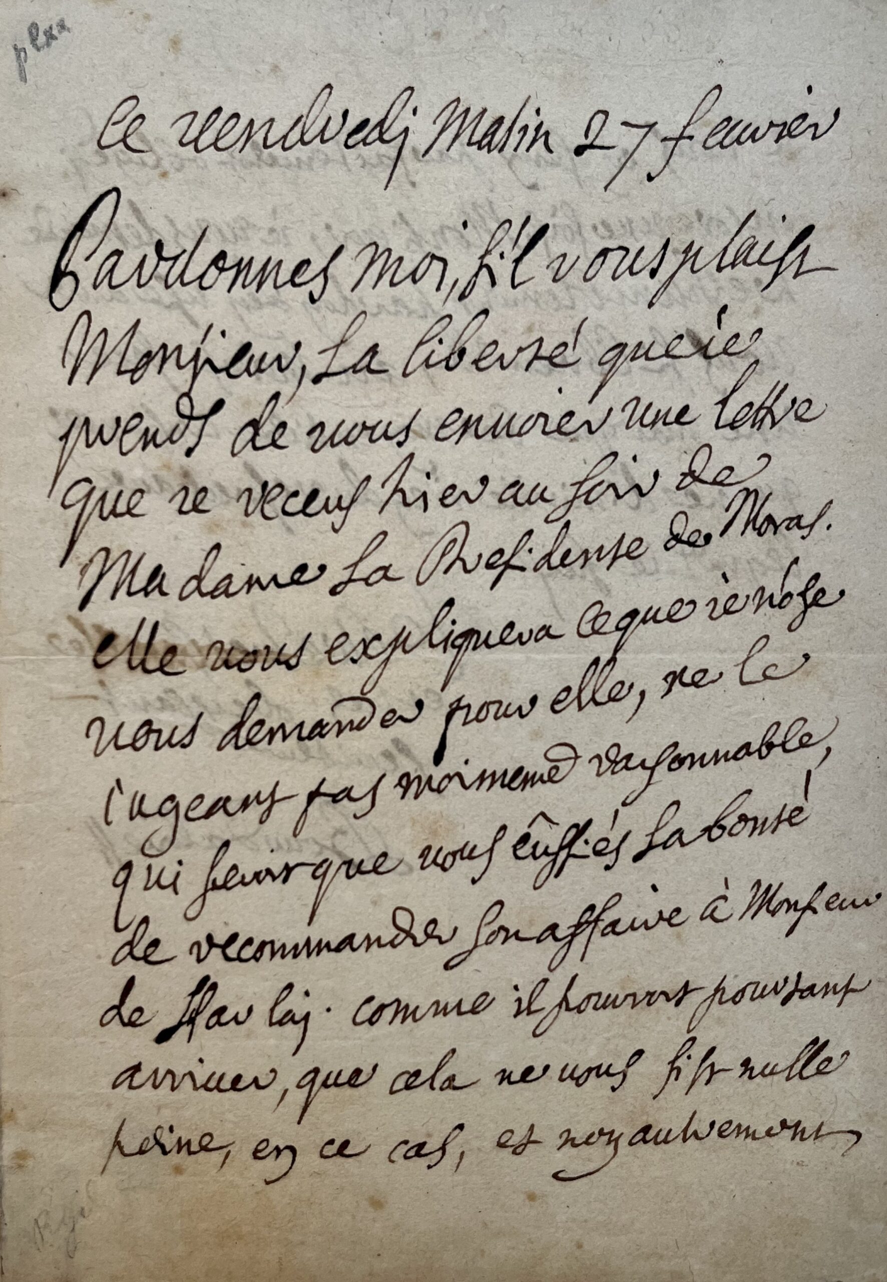 Louis Bourdaloue (Bourges , 1632/1704)"Pardonnes moi, s'il vous plaist Monsieur, la liberté que ie prends de vous envoyer une lettre que ie receus hier au soir de Madame la Princesse de Moras. Elle vous expliquera ce que ie n'ose vous demander pour elle, ne le iugeant pas moi meme raisonnable qui seroit que vous eûssiez la bonté de recommander son affaire à Monsieur de Harlay [très probablement François III de Harlay (]. Comme il pourroit pourtant arriver, que cela ne vous fist nulle peine, en ce cas, et non autrement ie vous en seroy parfaitement obligé ; encore une fois, Monsieur, ie vous demande tres humblement pardon d'en user avec vous si librement [...]".