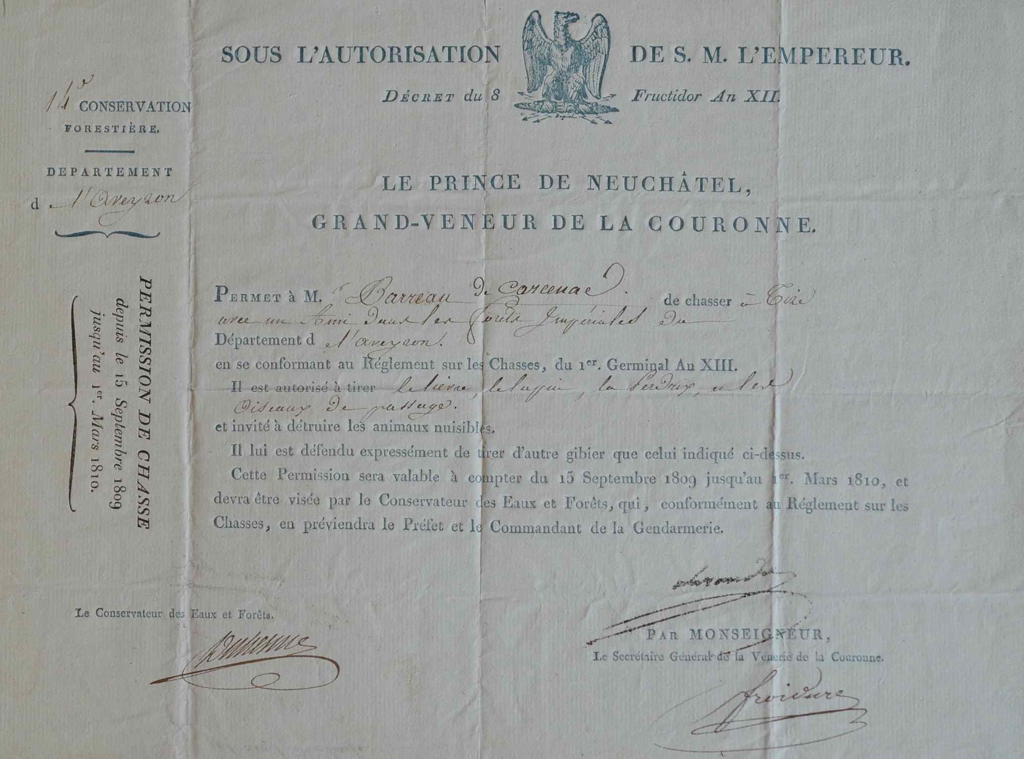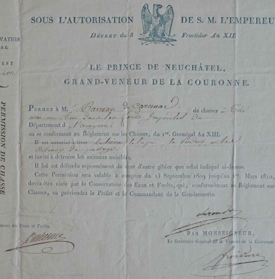Permis de "chasser à tire avec un ami dans les forêts impériales du département de l'Aveyron" accordé à M. Barreau de Carcenac. "Il est autorisé à tirer le lièvre, le lapin, la perdrix, et les oiseaux de passage et invité à détruire les animaux nuisibles. Il lui est défendu expressément de tirer d'autre gibier que celui indiqué ci-dessus. Cette permission est valable à compter du 15 septembre 1809 jusqu'au 1er mars 1810 [...]". Le document est signé par le maréchal Berthier (griffe), le conservateur des eaux et forêt et le secrétaire général de la vénerie de la Couronne.