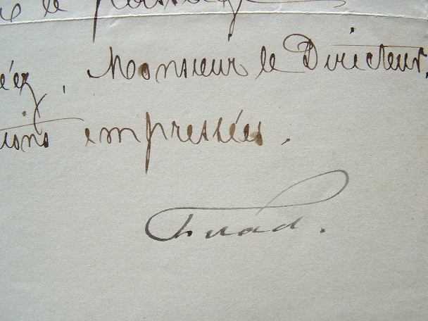 «Monsieur le docteur Roussignan, attaché à la mission impériale, se rendant à Constantinople, je viens vous prier de m'envoyer un billet de passage à bord d'un des bateaux de la compagnie que vous dirigez en accordant le rabais usité en faveur des employés de l'Etat [...]». Il lui demande l'heure du départ.