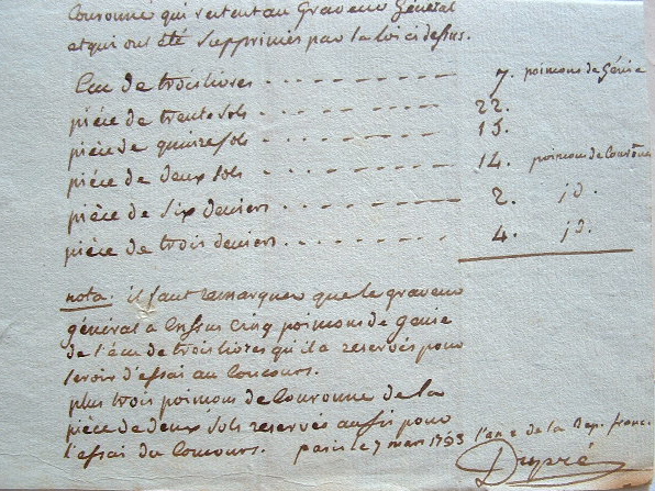 Augustin Dupré (Saint-Etienne, 1748/1833)Le graveur général des monnaies, Augustin Dupré, dresse un inventaire des poinçons, et signe le document à deux reprises : "Etat des poinçons de tête qui restent au graveur général et qui ont été supprimés par la loi du 5 février 1793", "Etat des poinçons de génie et de couronne qui restent au graveur général et qui ont été supprimés par la loi ci-dessus" ; "Etat des poinçons originaux de tête de génie et de couronne remis à la commission des monnoyes en conformité de son arrêté du 25 février 1793" ; "Etat des matrices de tête de pile et d'ornement". Au total, plus de 250 poinçons pour une trentaine de pièces sont référencés. Dupré précise : «Il faut remarquer que le graveur général a en sus cinq poinçons de génie de l'écu de trois livres qu'il a réservés pour servir d'essai au concours. Plus trois poinçons de couronne de la pièce de deux sols réservés [...]».